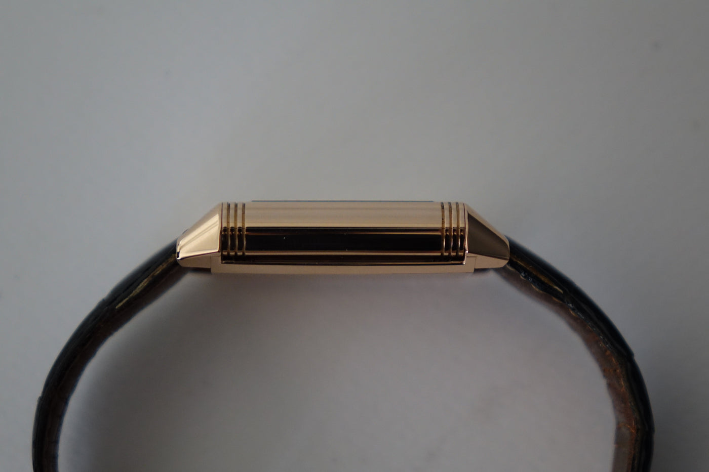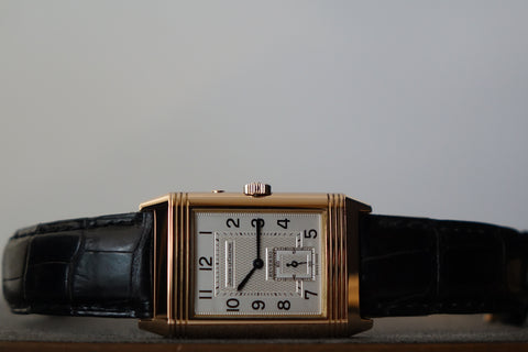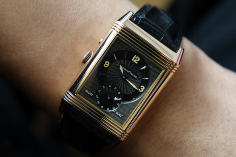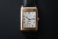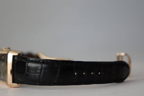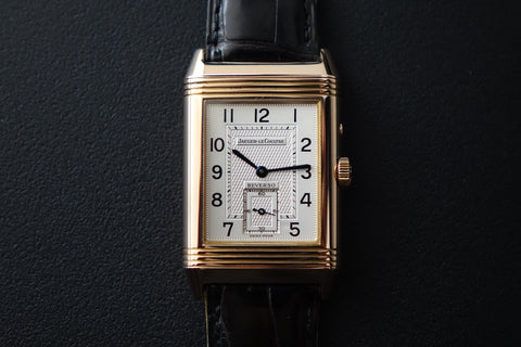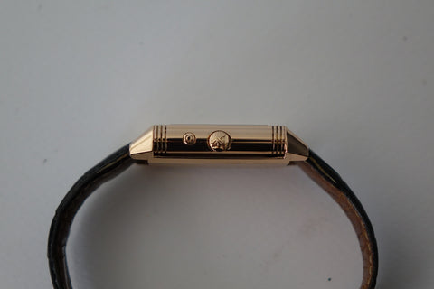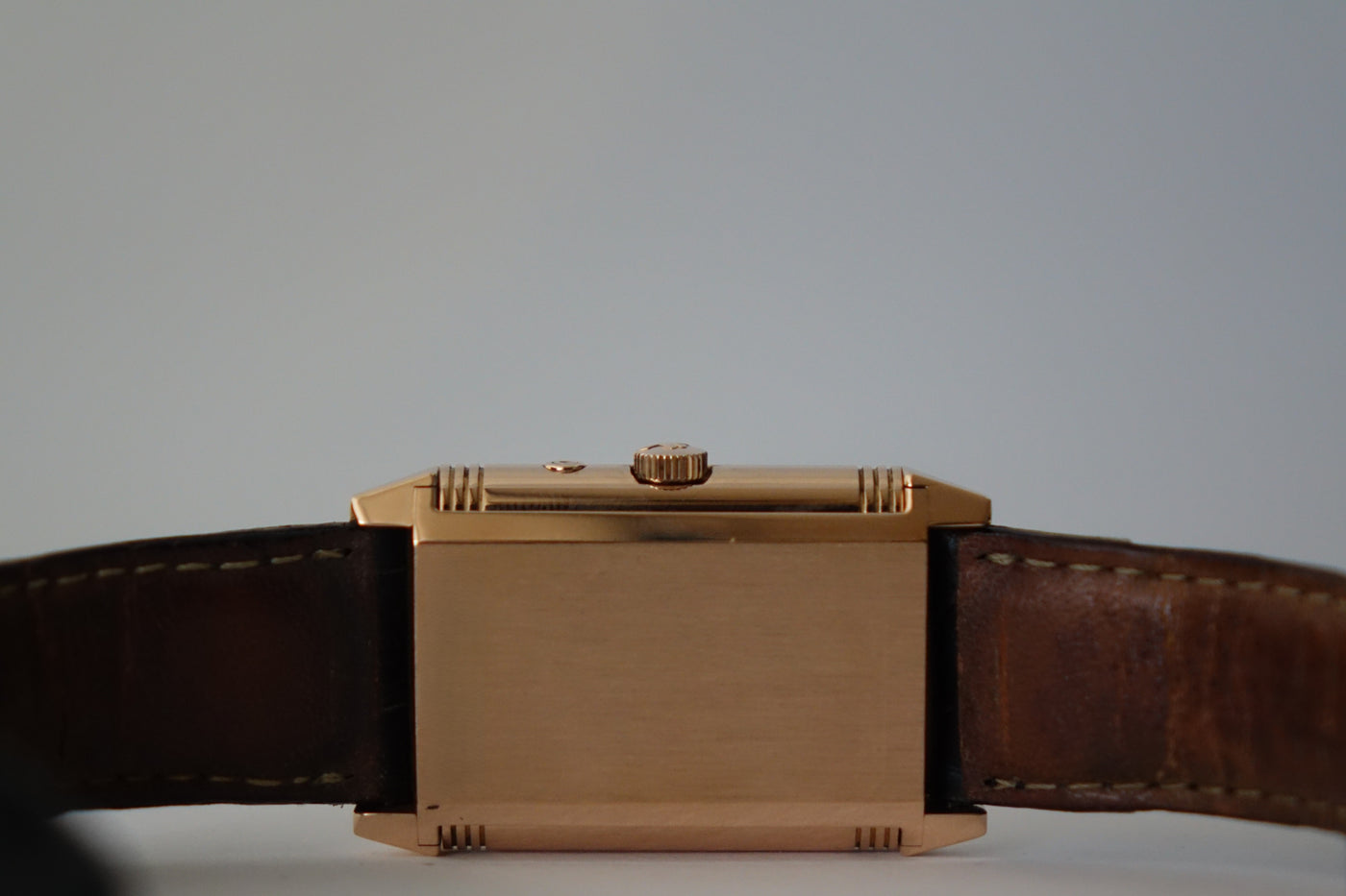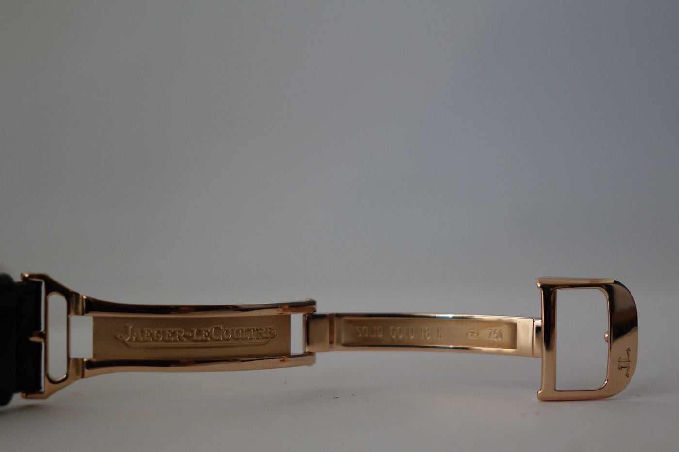 Offered here is a beautifully executed piece in 18k rose gold that epitomizes JLC’s mastery of dual-time elegance. Featuring two dials—one silvered with guilloché texture and the other a contrasting black display with a day-night indicator. It’s powered by the manual-winding Calibre, allowing seamless switching between time zones. First created in 1931 for polo players seeking a reversible watch that could withstand impact, the Reverso has since become an icon of Art Deco design and mechanical ingenuity. Strap is well used