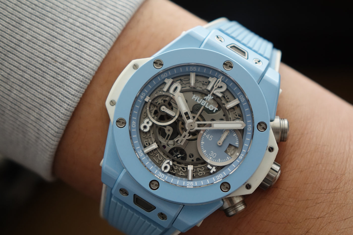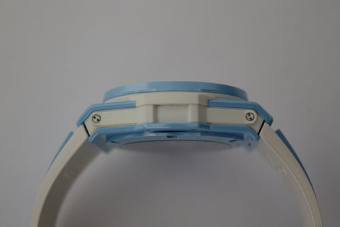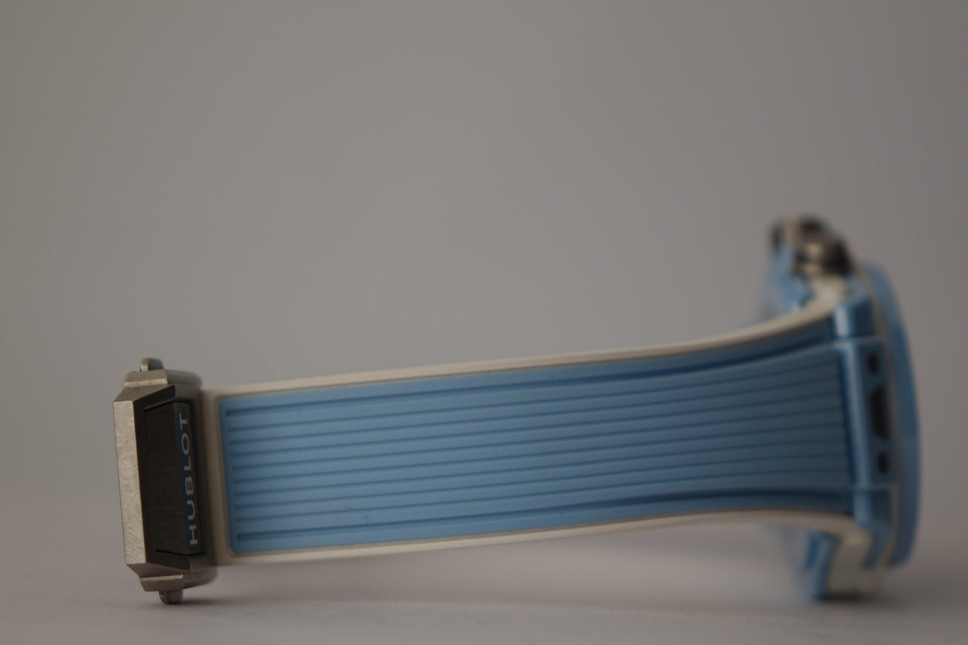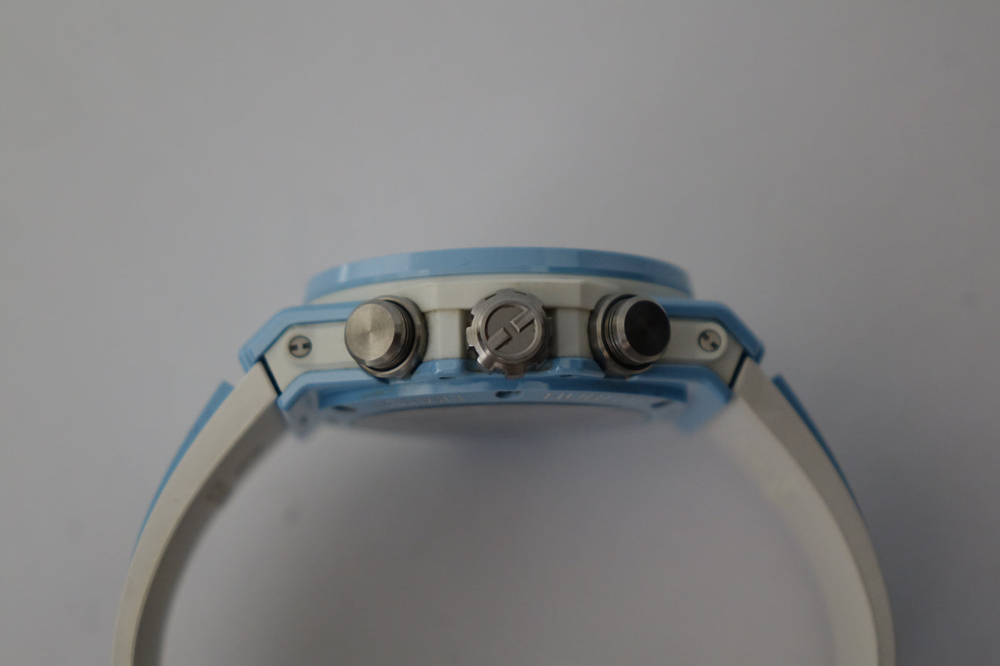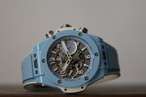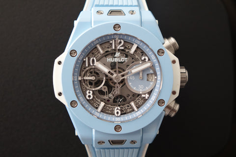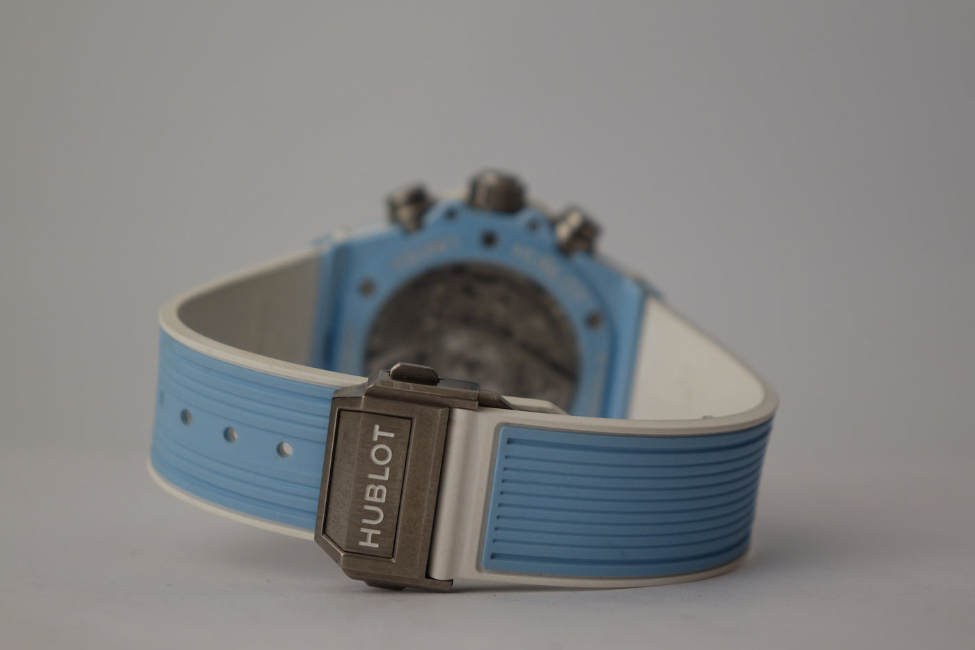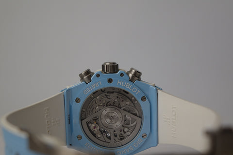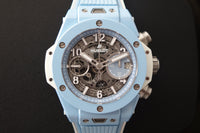 Limited Edition of only 200 pieces. Offered here is a stunning and limited-edition chronograph that perfectly embodies Hublot’s bold Art of Fusion philosophy. Crafted entirely from polished and satin-finished sky blue ceramic, which gives the watch a fresh, modern aesthetic that stands out while remaining refined and versatile. Introduced as part of the Big Bang Unico collection, which debuted in 2005, the Sky Blue continues Hublot’s legacy of innovation by blending avant-garde design with technical mastery in a truly eye-catching package.