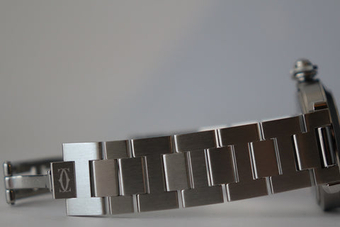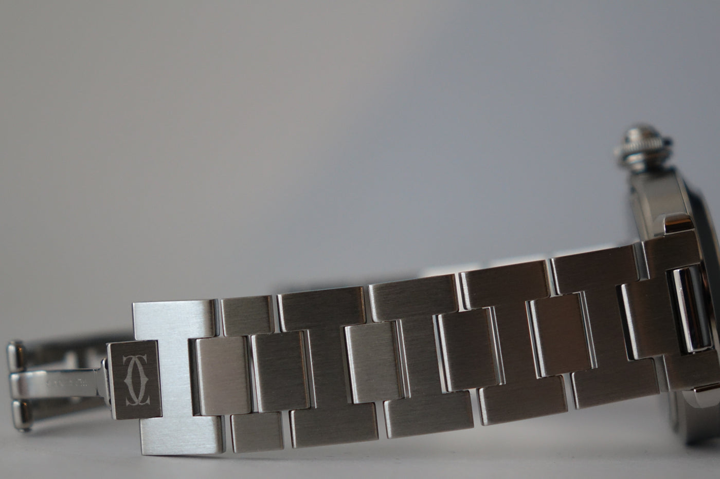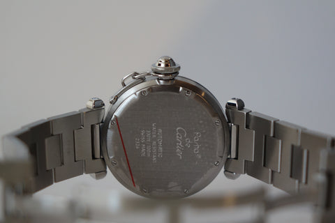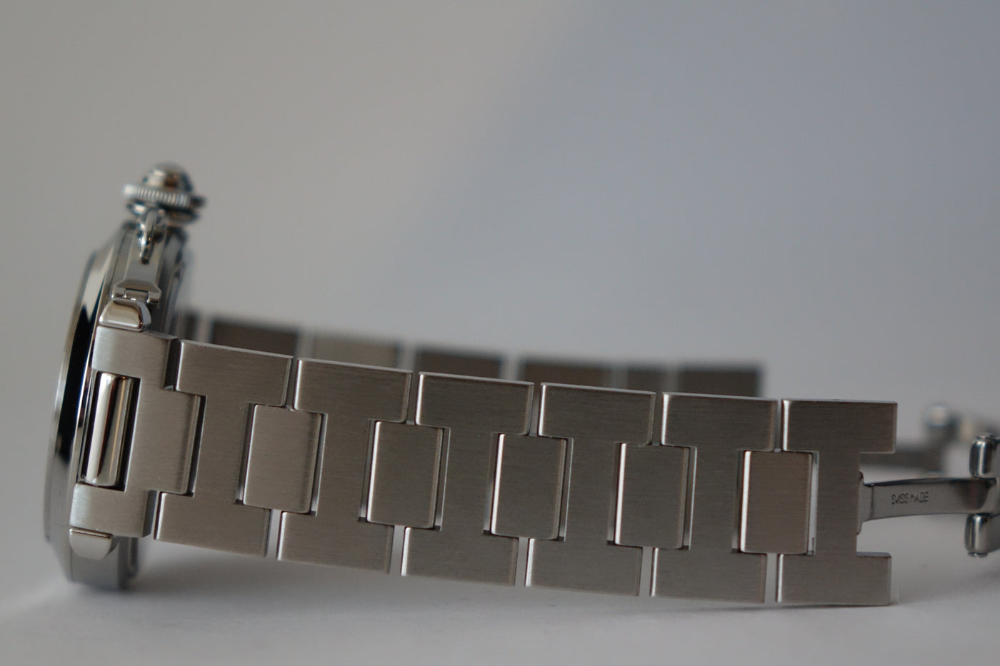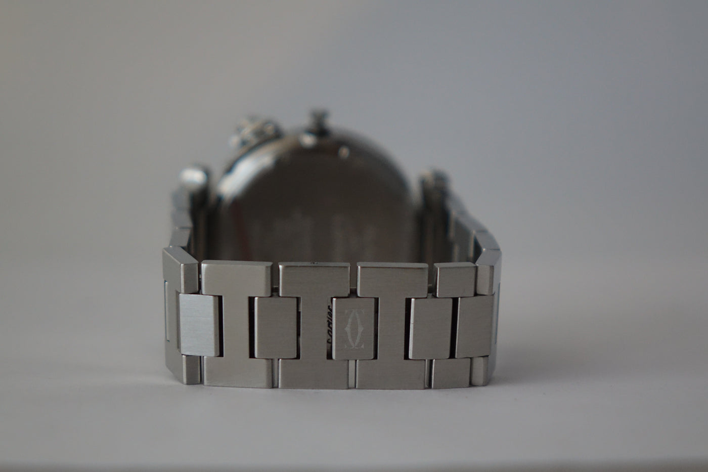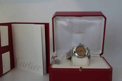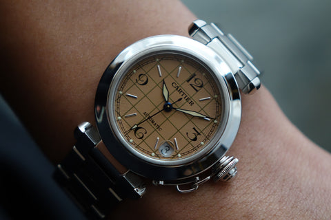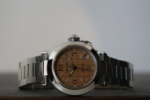 The Cartier Pasha with a salmon dial is a rare and charming configuration that brings a warm, sophisticated personality to this iconic design. Salmon is a colour Cartier uses sparingly, making this variant especially desirable among collectors. The 35mm case gives it a modern-vintage presence on the wrist, balancing everyday versatility with a distinctive look. As a discontinued reference, the salmon-dial Pasha C has become increasingly sought after, offering individuality, elegance, and classic Cartier character in one beautifully wearable piece