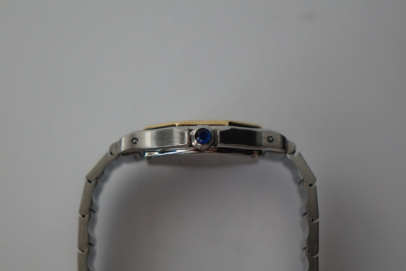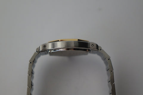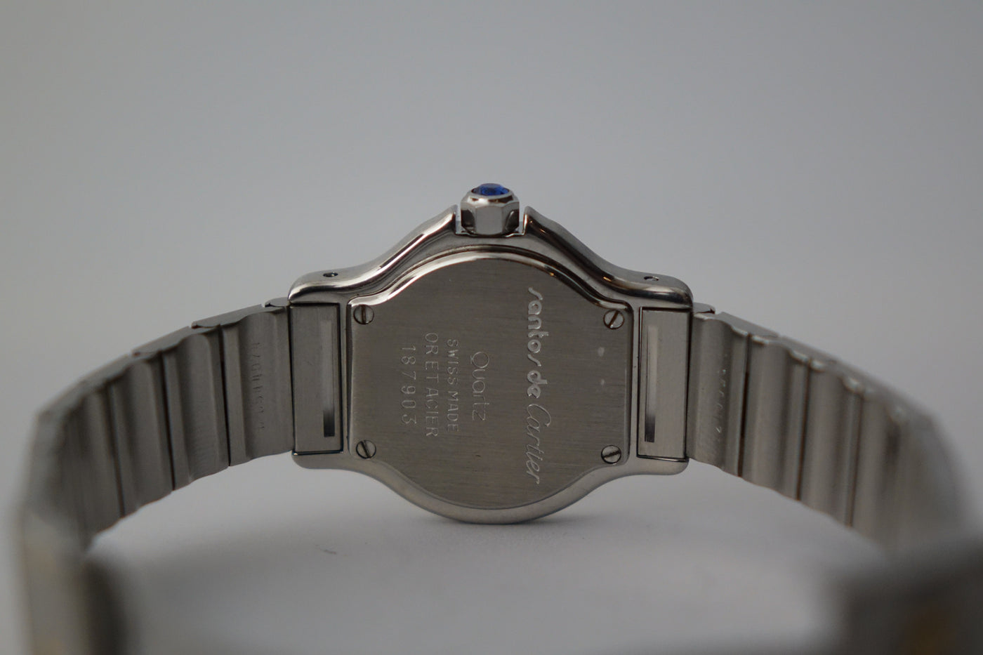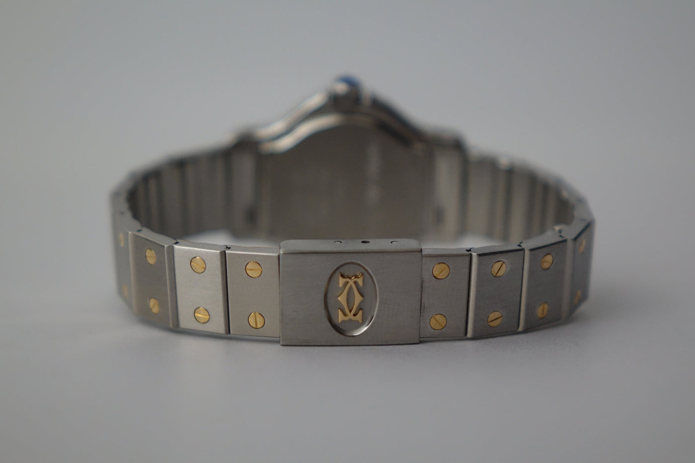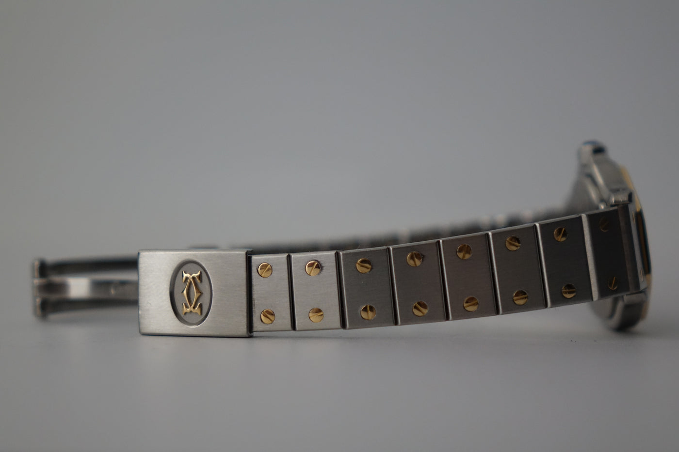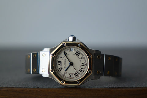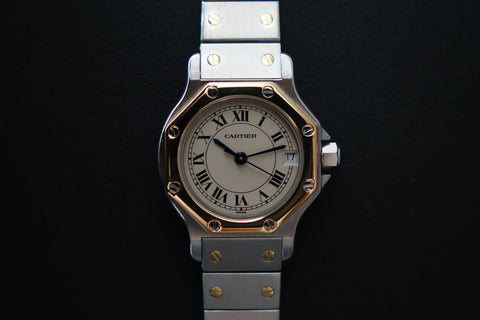 Offered here is a compact lady’s two-tone Santos with a quartz movement, sapphire crystal, date function, ivory Roman dial, and Cartier’s signature blue steel hands. Drawing from Cartier’s storied Santos line—which began in 1904 when Louis Cartier built one of the first wristwatches for aviator Alberto Santos-Dumont—this Octagon variant emerged in the late 1980s-1990s during Cartier’s era of blending sporty geometry (octagonal bezel, exposed screws) with elegant jewelry watch cues.