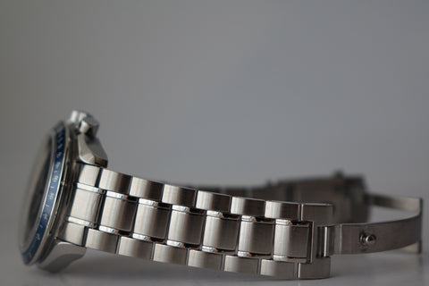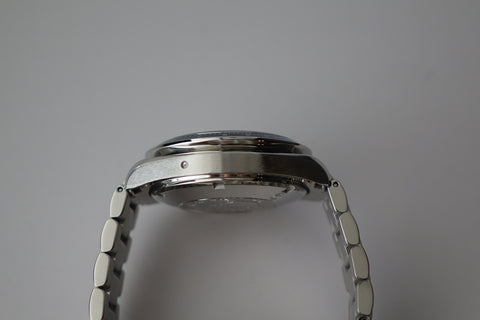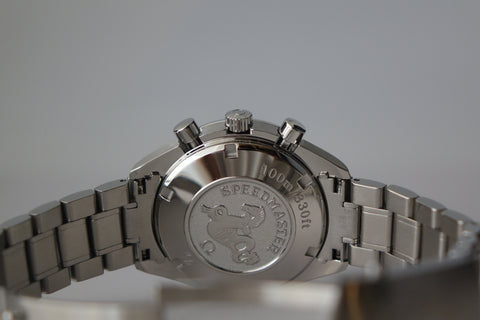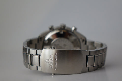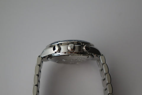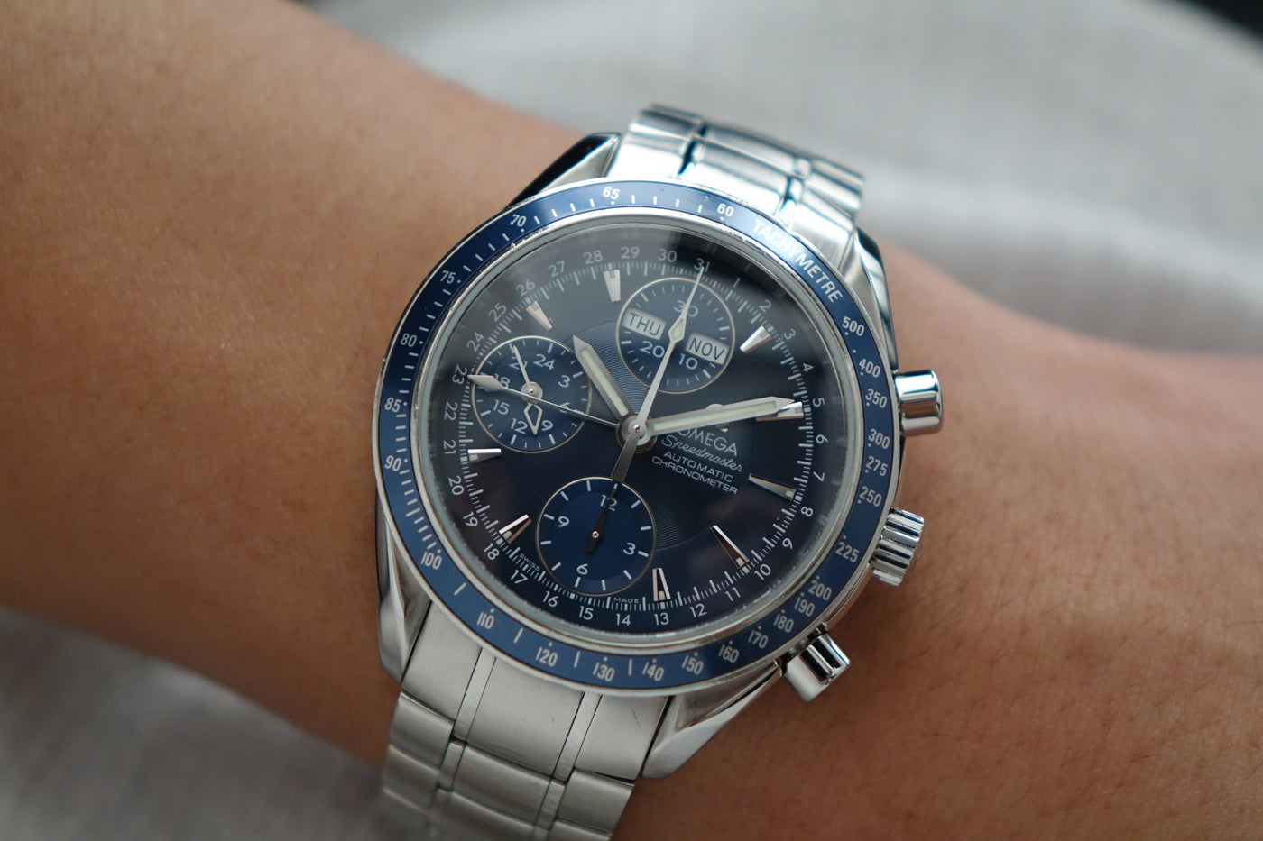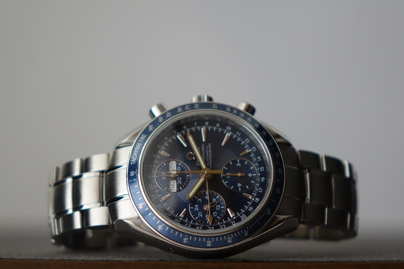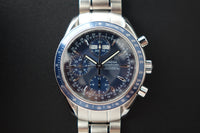 Offered here is a striking blue dial stainless steel automatic chronograph featuring day, date and month calendar functions in the style of a full triple-date chronometer. Introduced around the late 2000s and now discontinued, this model blends the legendary Speedmaster lineage with robust functionality and an uncommon full-calendar layout. Box is flaky