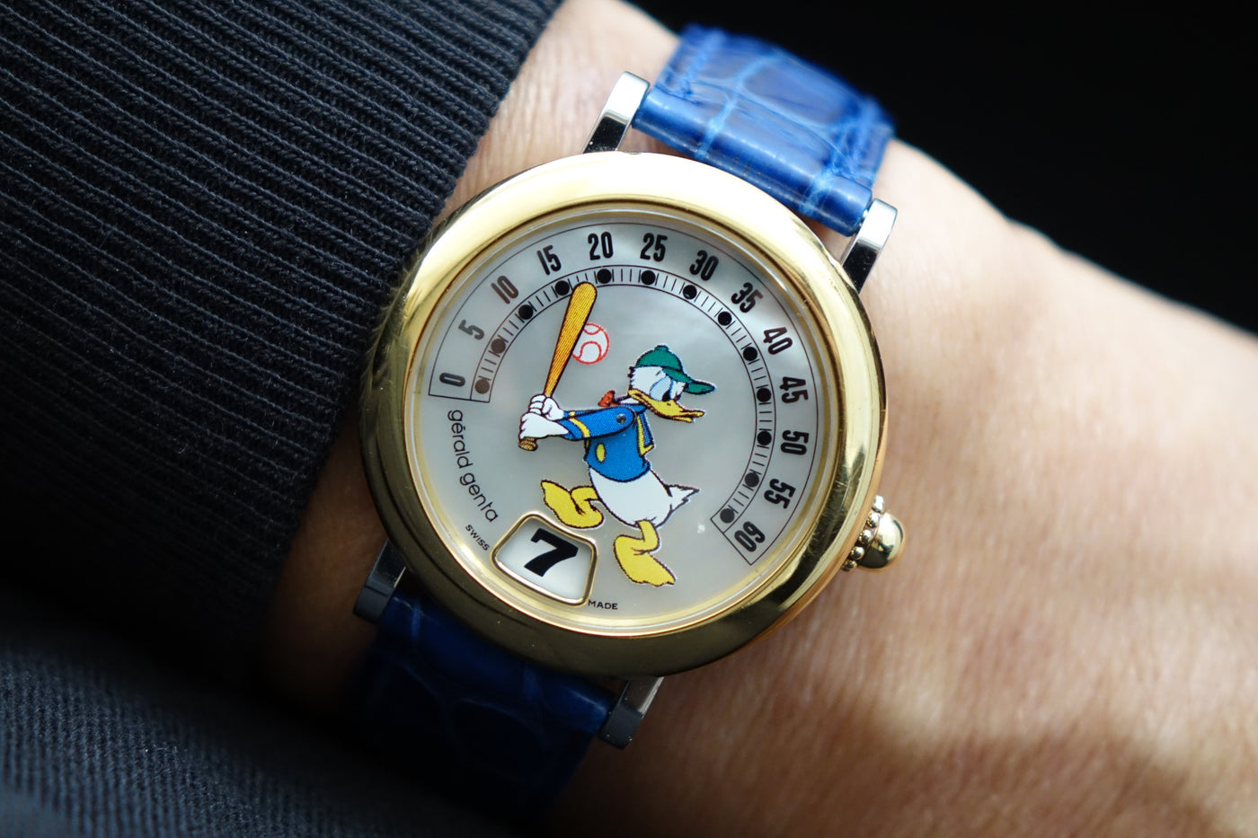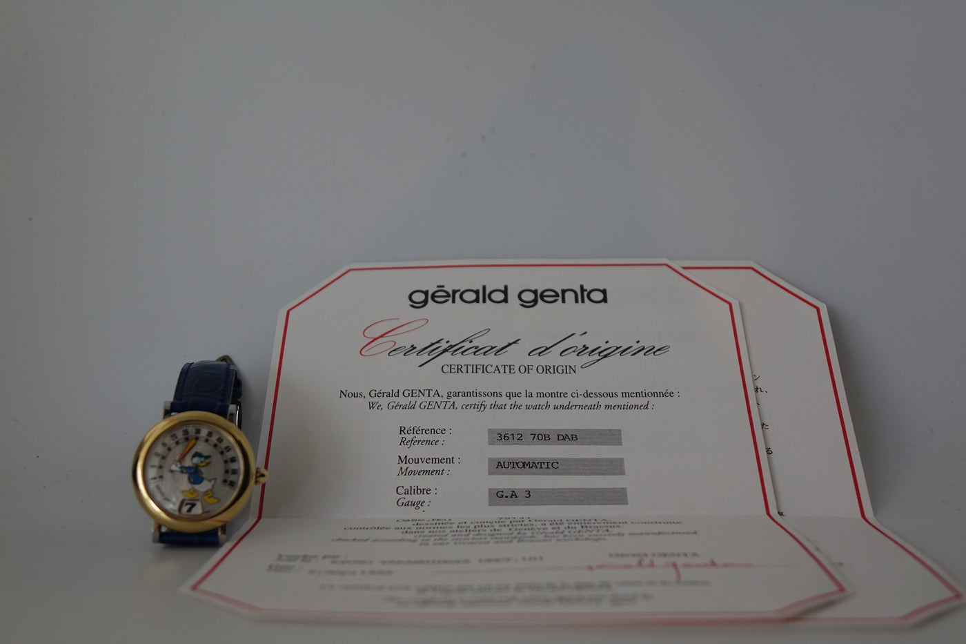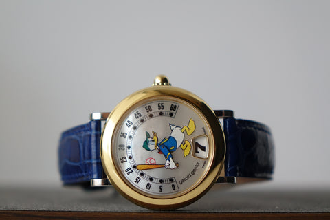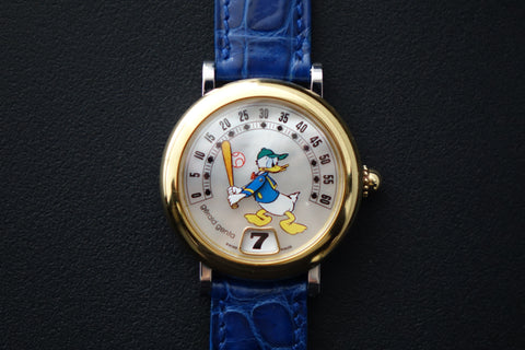 Offered here is the Gérald Genta Retro Fantasy Donald G.3612, a highly collectible piece from the legendary Gérald Genta — the designer behind icons like the Royal Oak and Nautilus. Part of Genta’s famous Disney-licensed series from the 80s and 90s, this model features the signature jumping hour and retrograde minute display, with Donald’s arm sweeping across the dial. This example comes with a beautiful mother-of-pearl dial and is executed in a rarer half-gold configuration, which is seen far less frequently than the standard steel versions. Quirky yet mechanically serious, and offered here with its original papers, the G.3612 stands out as a rare and characterful neo-vintage collector’s piece.