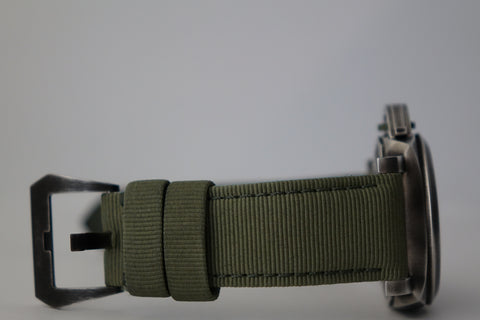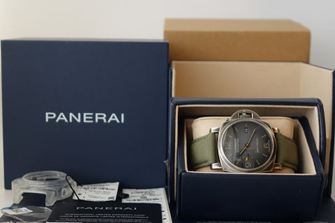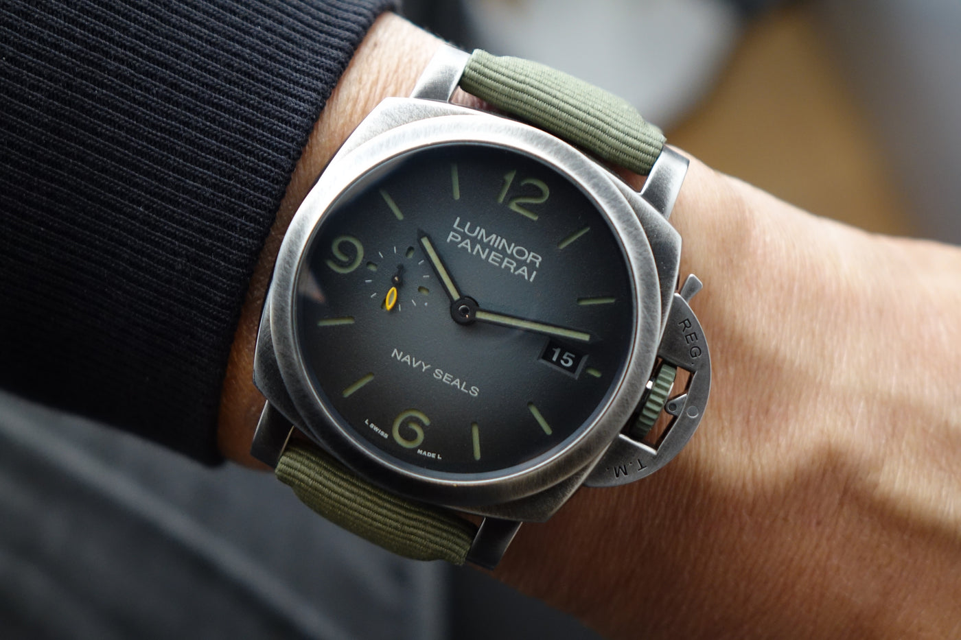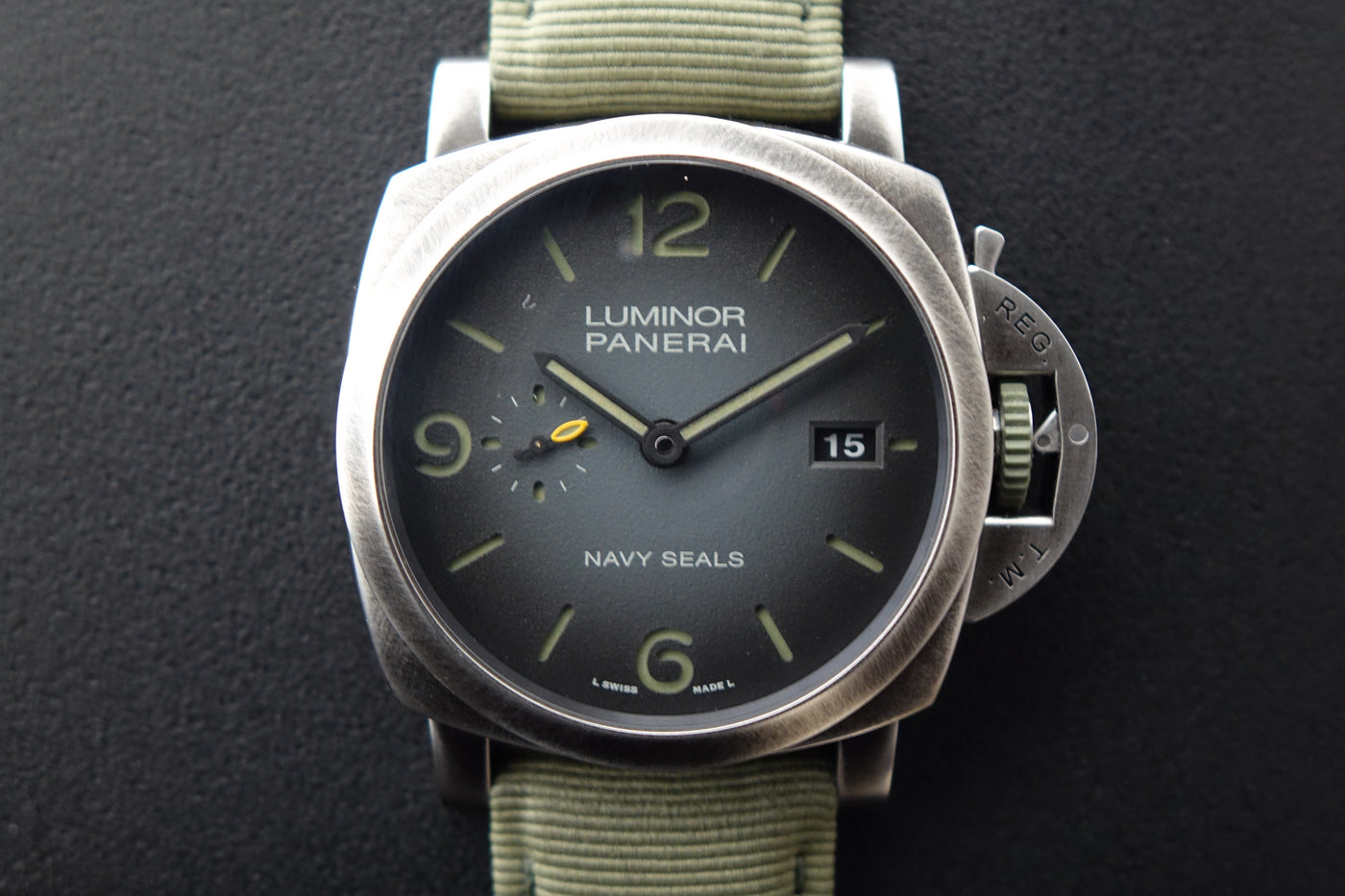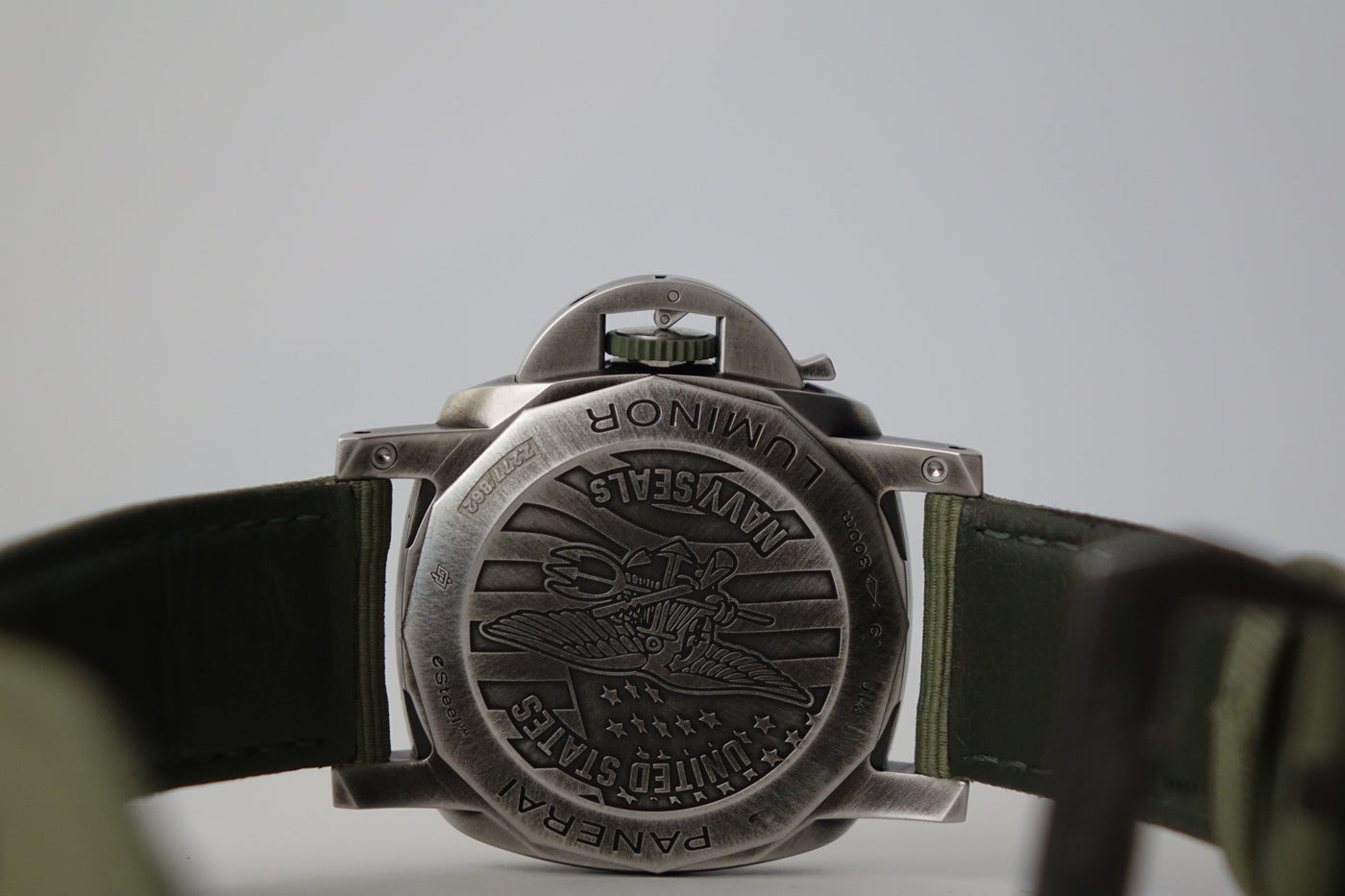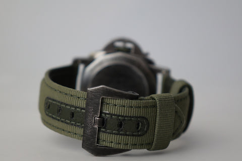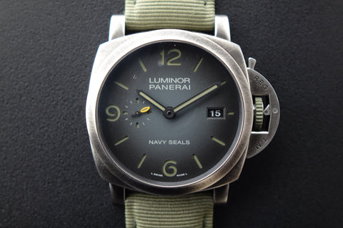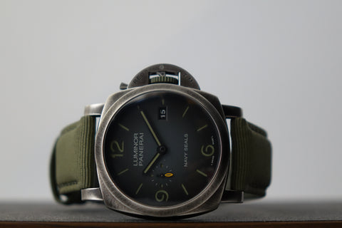 Part of Panerai’s modern military collaboration, the PAM01412 combines the brand’s ties to the U.S. Navy SEALs with its newer eSteel construction — a recycled steel material developed under Panerai’s sustainability initiative. Featuring the SEALs insignia on the caseback and a more tactical design language, it carries a rugged, purposeful presence that stands out from standard Submersible models while still wearing bold and unmistakably Panerai on the wrist.
