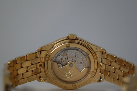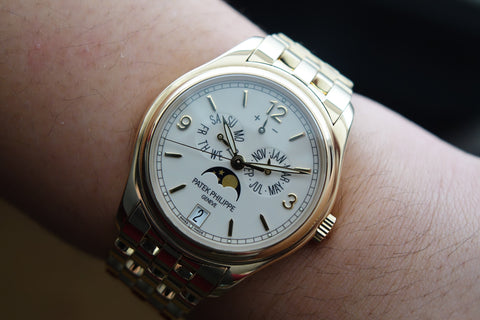 Offered here is a beautifully refined yellow gold annual calendar wristwatch that combines classic Patek Philippe elegance with everyday practicality. Featuring a crisp dial layout with day, date, month, moonphase and power reserve indications, it is powered by Patek’s automatic annual calendar movement, which only requires adjustment once per year at the end of February, a complication that bridges the gap between a simple calendar and a perpetual calendar with amazing daily usefulness.