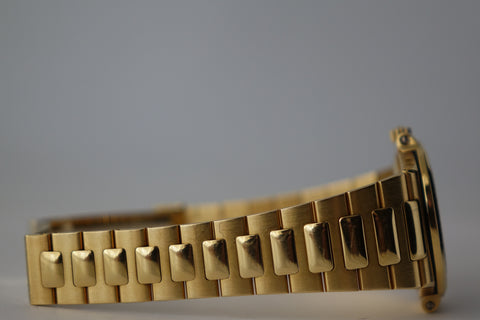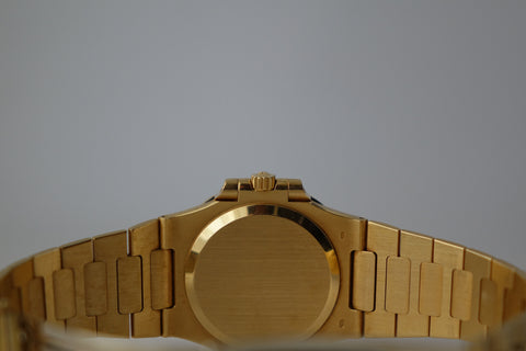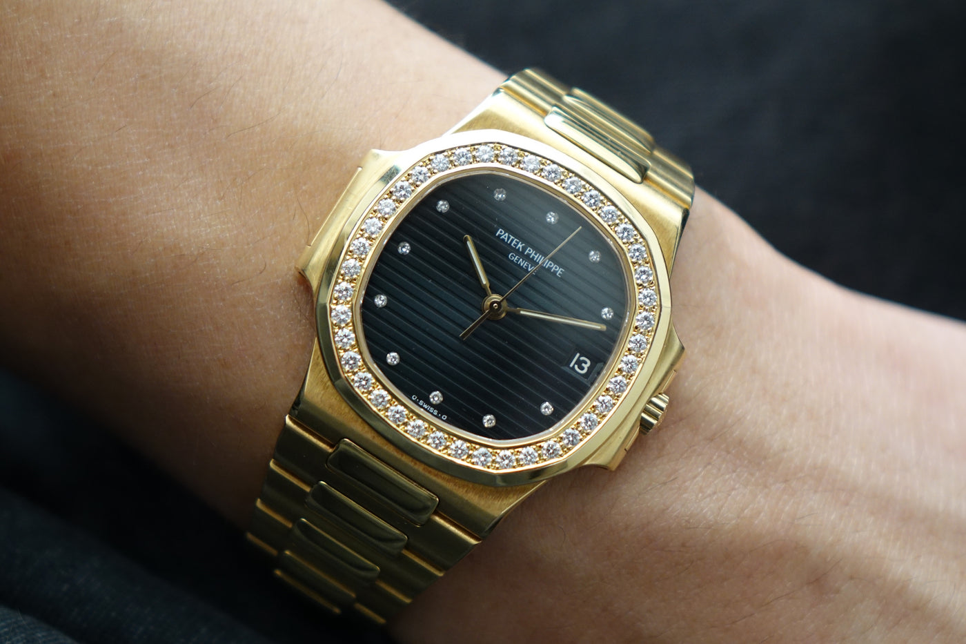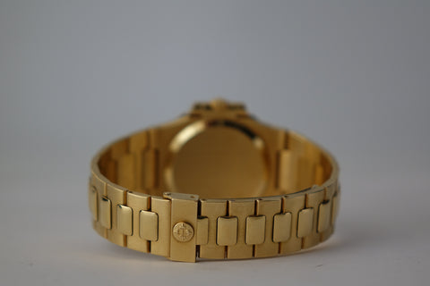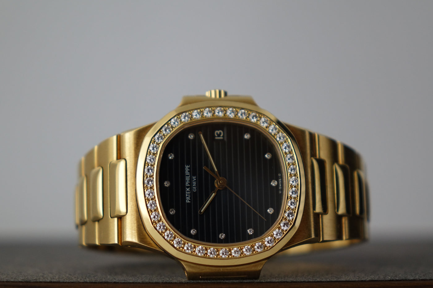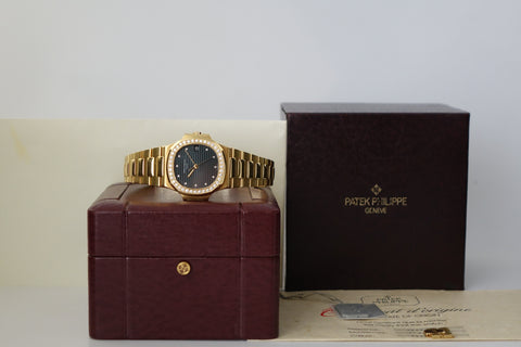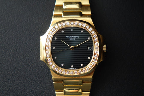 Offered here is the Patek Nautilus 3800 in an exceptionally rare factory diamond-set configuration, fitted with its original factory diamond bezel and matching diamond markers set against the signature blue ribbed dial. A stark contrast to the usual steel Nautilus pieces that surface regularly, gem-set 3800s were produced in far smaller numbers — with even fewer preserved today as complete full sets. This example carries the wrist presence of a jewellery piece while retaining the unmistakable Nautilus DNA collectors love, making it a far more special proposition than standard variants — perfect for buyers who want a Nautilus that truly stands apart!