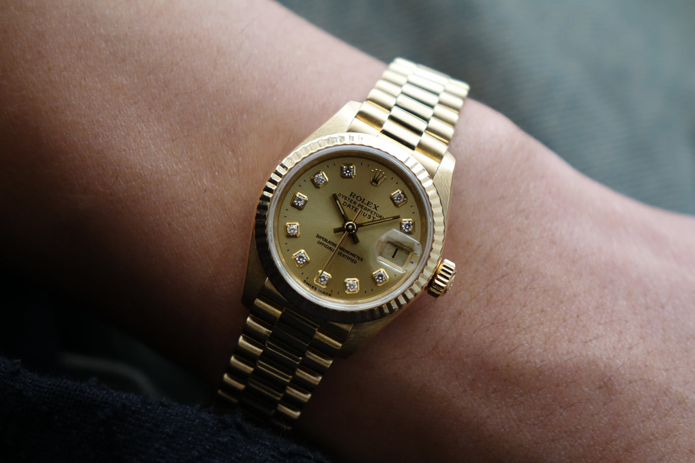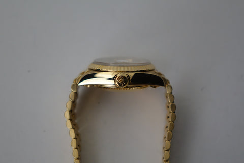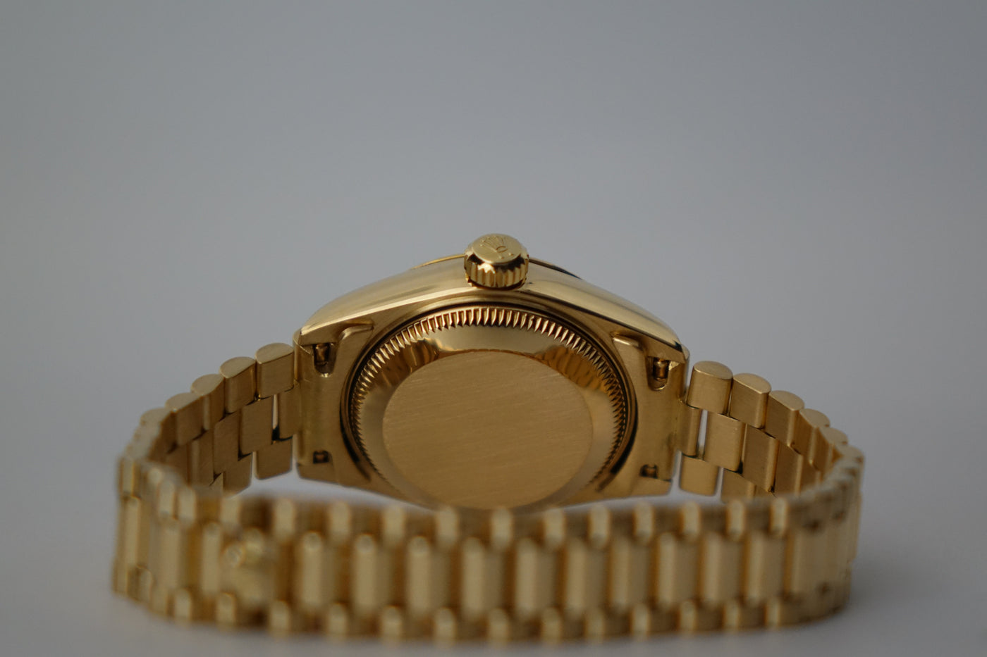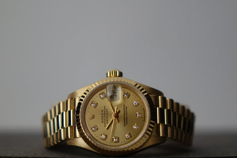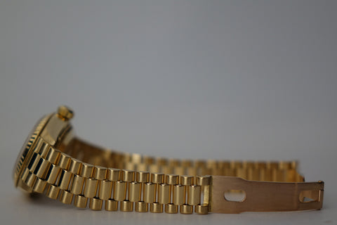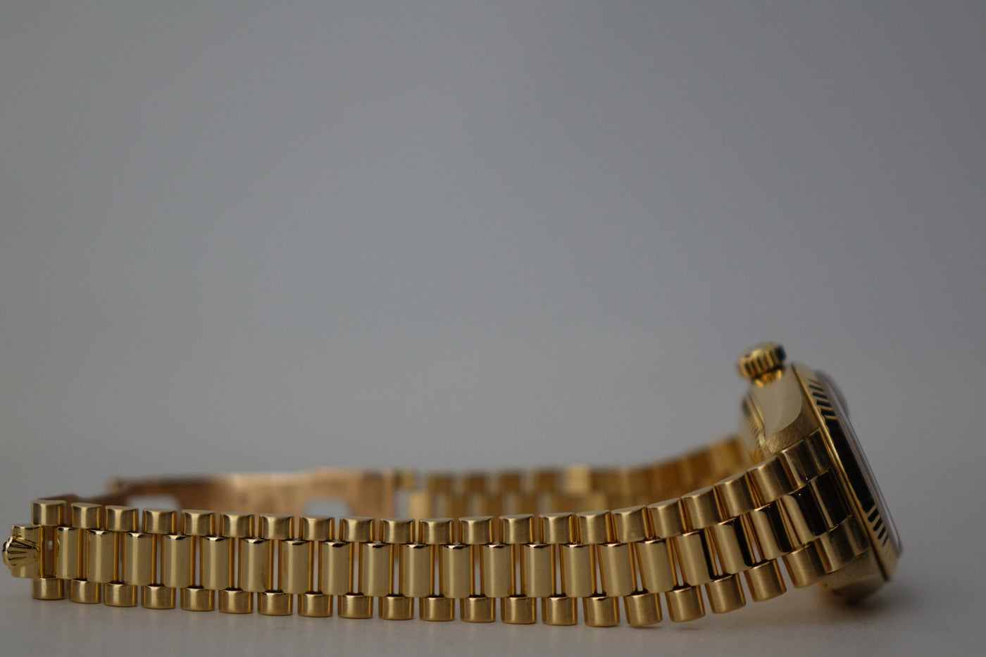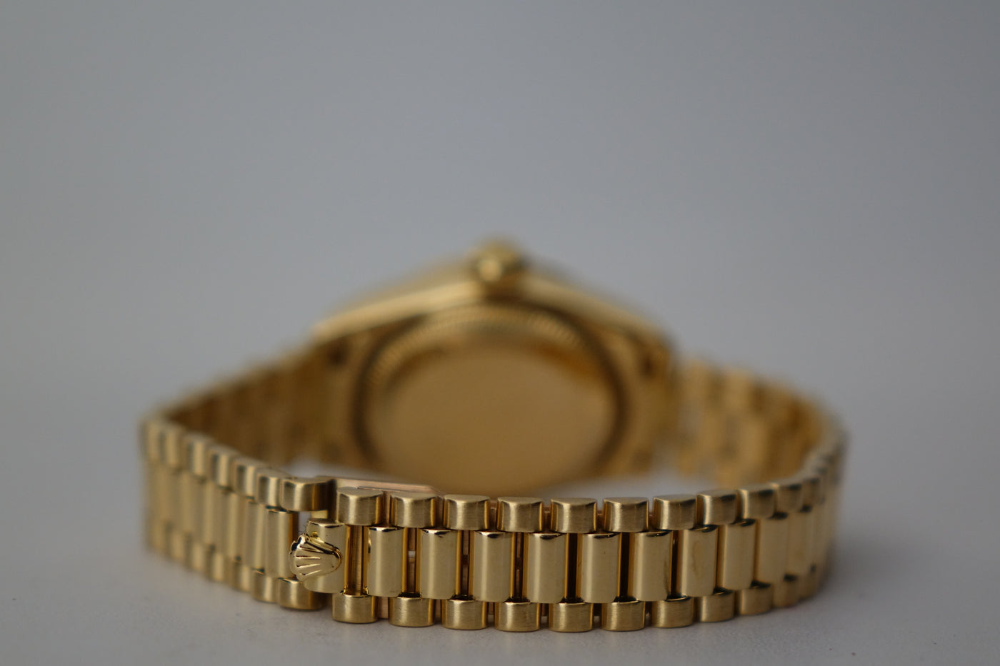 Presenting the Rolex Datejust Ref. 69178G — a classic ladies’ President configuration offered here in solid 18k yellow gold and fitted with the timeless champagne 10-point diamond dial. The warm champagne tone paired with factory-set diamond hour markers gives the watch an elegant, dressy presence while staying true to the understated luxury the Datejust is known for. Completed with the iconic President bracelet, it delivers that unmistakable full-gold Rolex look on the wrist, making it a refined and highly wearable ladies’ classic with enduring appeal.