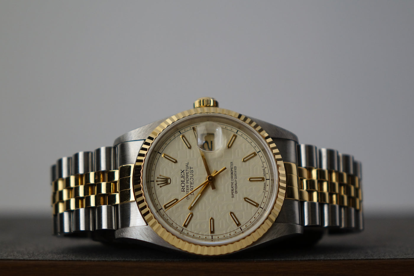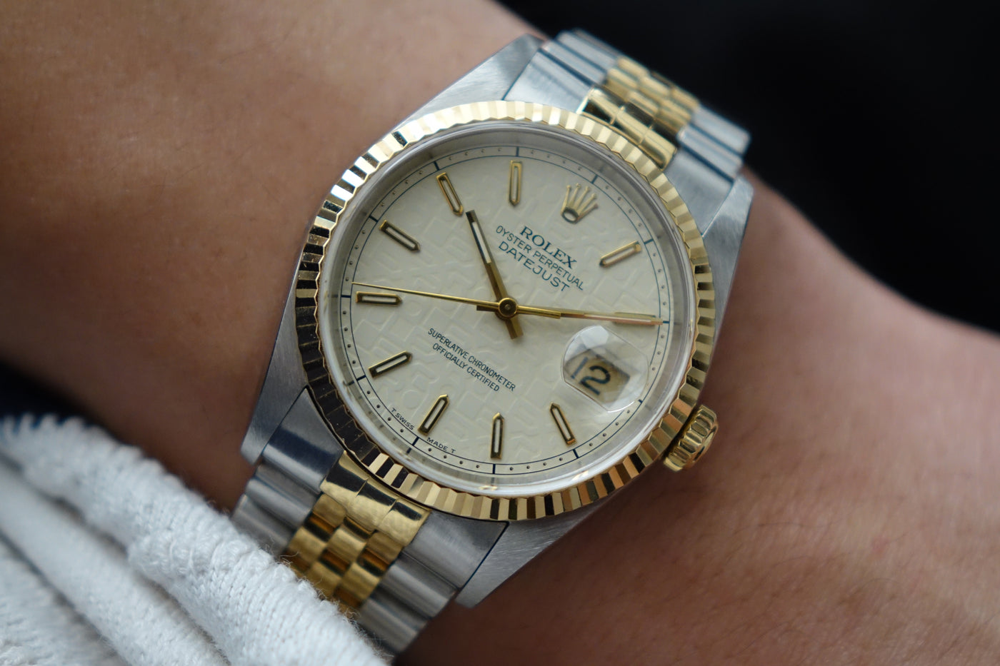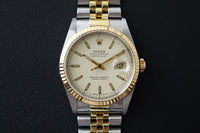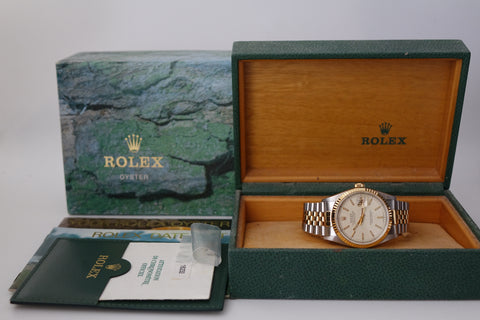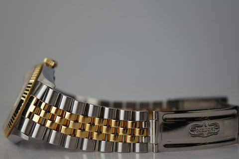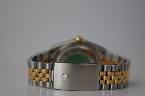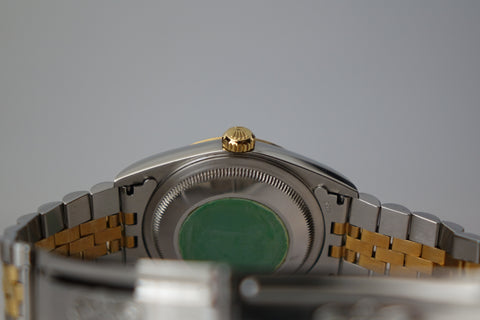 This Rolex Datejust 16233 featuring the rare off-white “Computer” dial and its original caseback sticker preserved is a standout example of an uncommon and increasingly appreciated two-tone 5-digit Datejust. The repeating “ROLEX” motif gives the dial a distinctive and luxurious texture that sets it apart from standard variants, pairing beautifully with the classic fluted bezel and Jubilee bracelet. With the factory caseback sticker still intact, this example stands out for its originality and well-preserved condition — qualities collectors genuinely value in a vintage Datejust.