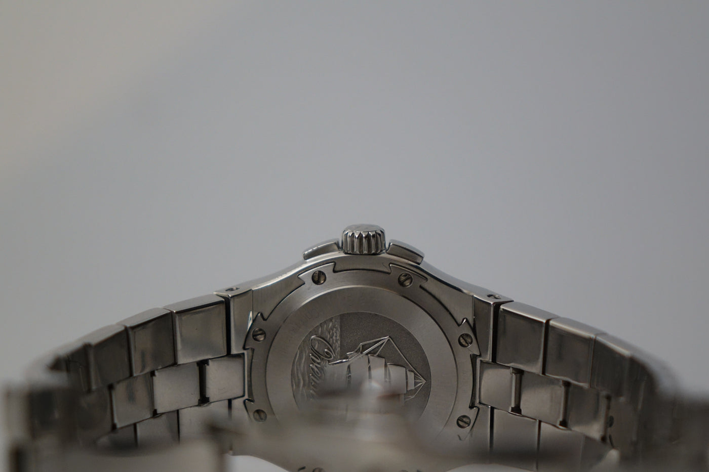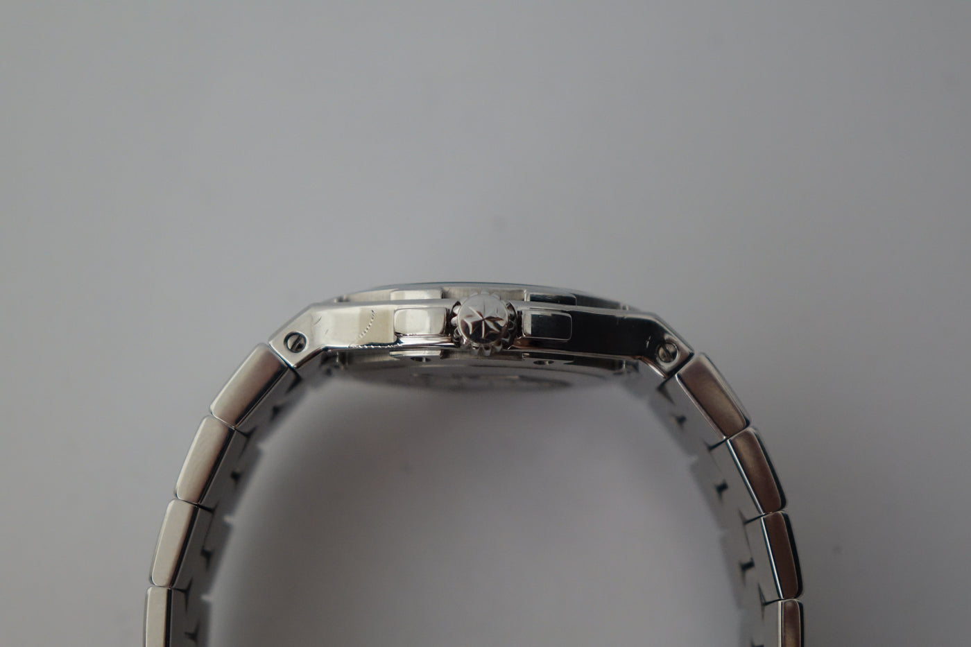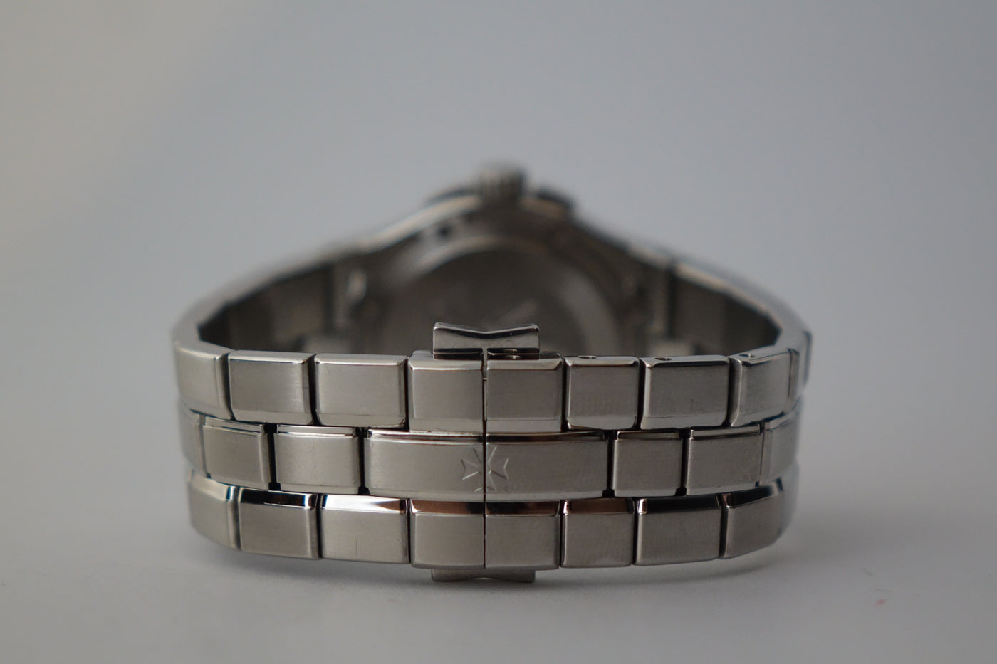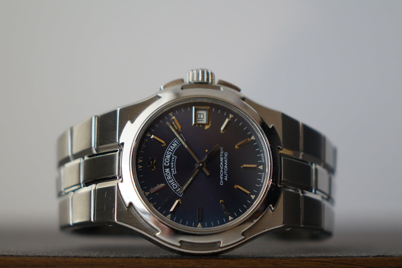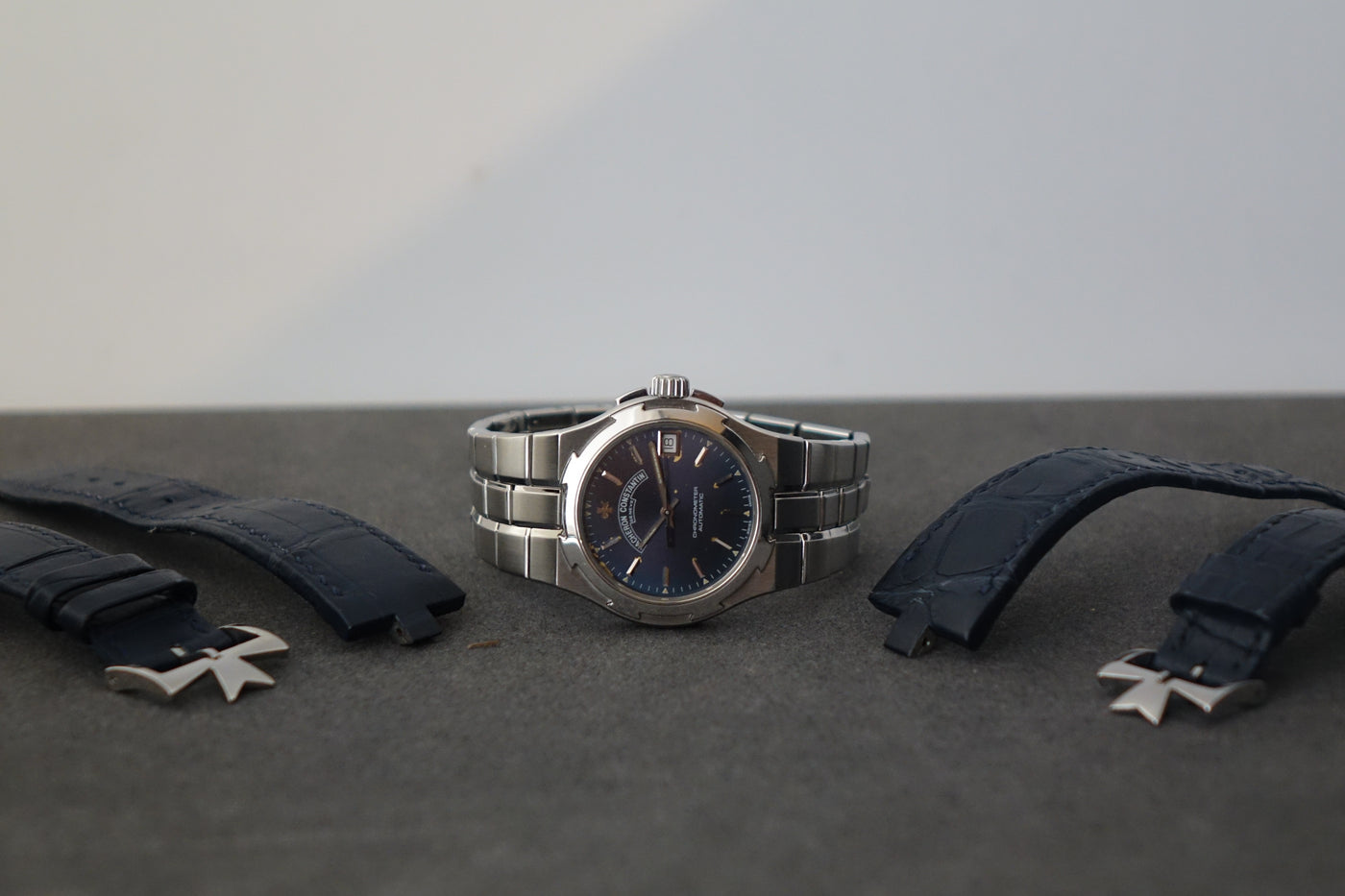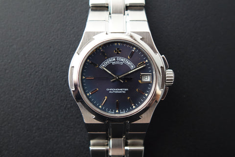 Offered here is a distinguished stainless steel automatic with a blue dial. With its classic Overseas design, integrated bracelet, slim profile, and hallmarks of Vacheron’s craftsmanship, it’s the ideal sporty dress-watch. The Overseas line was introduced in the 1990s to succeed the iconic 222, blending elegance with travel-ready ruggedness.