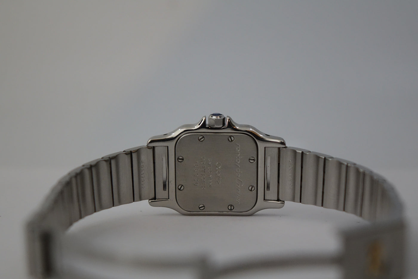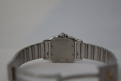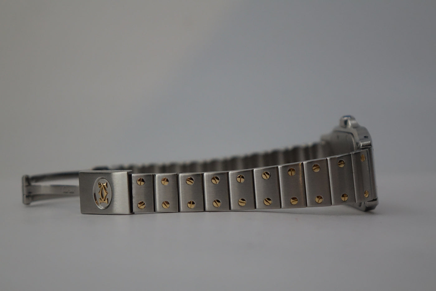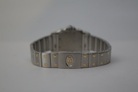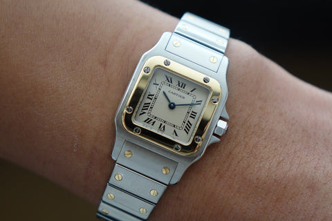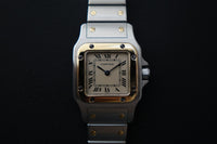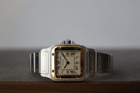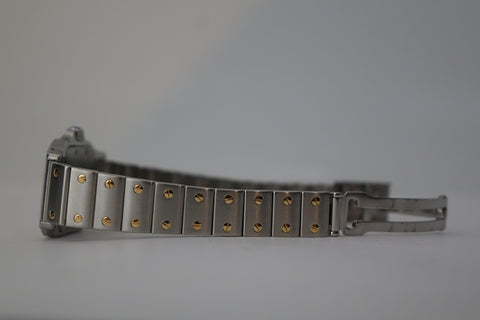 Offered here is a elegantly sized two-tone watch, fitted with a quartz movement, sapphire crystal, and Cartier’s classic Roman numeral dial with blued steel hands. First created as part of the Santos line—one of the earliest men’s wristwatches dating back to 1904 for aviator Alberto Santos-Dumont—the Galbée variants (1980s-2000s) preserved that heritage in more wearable sizes.