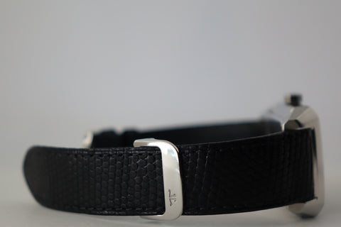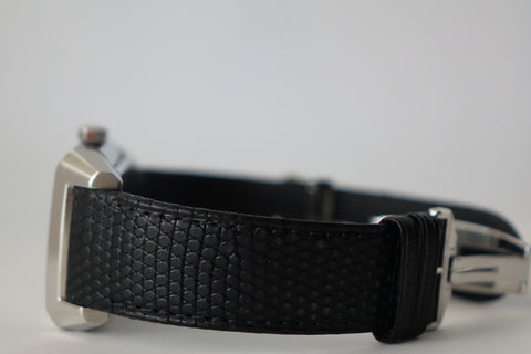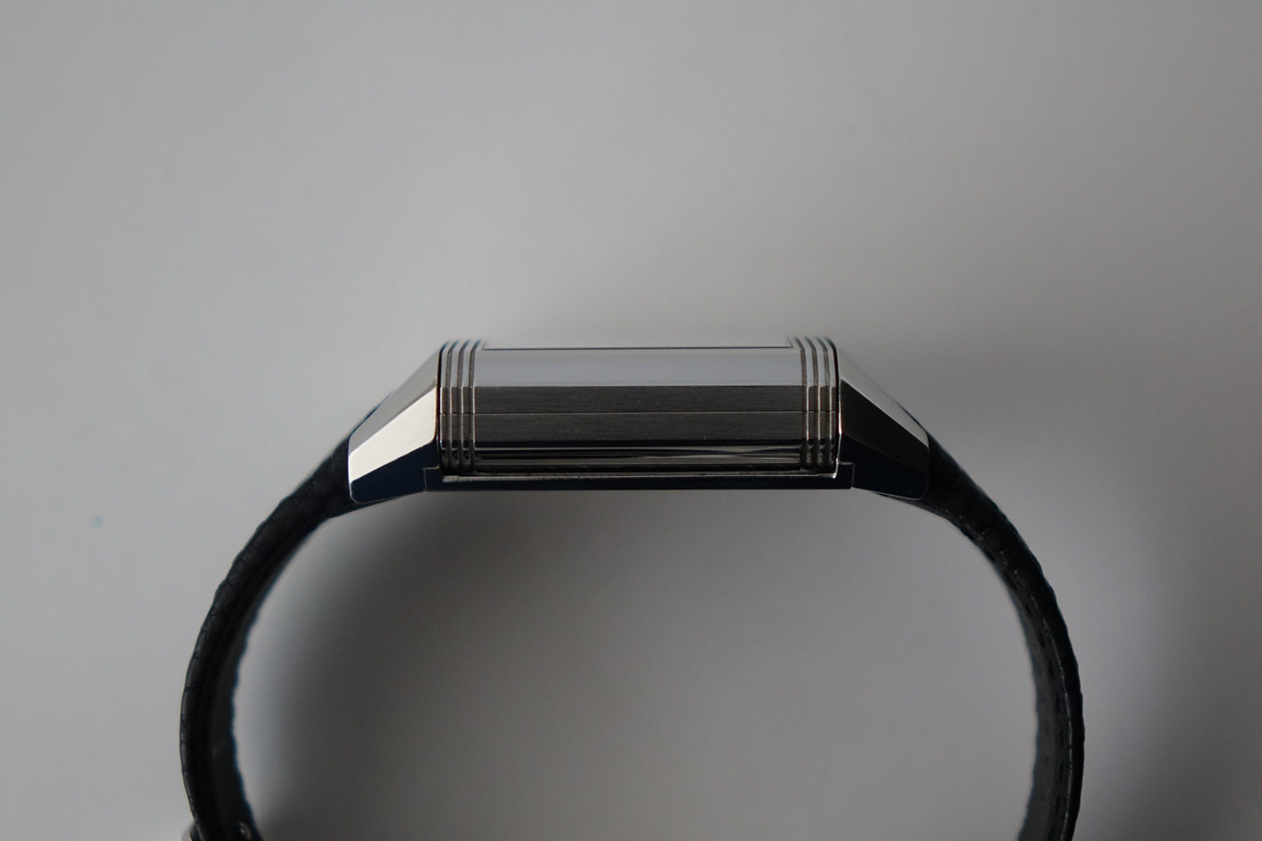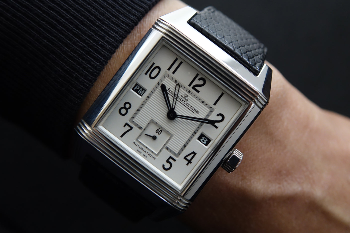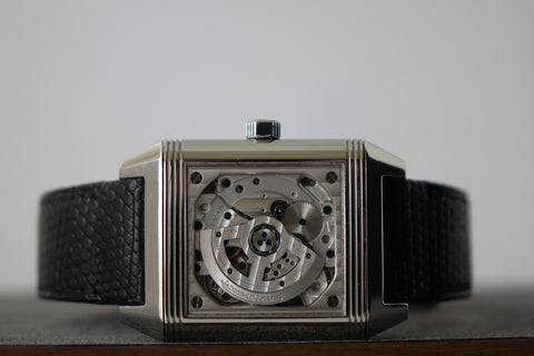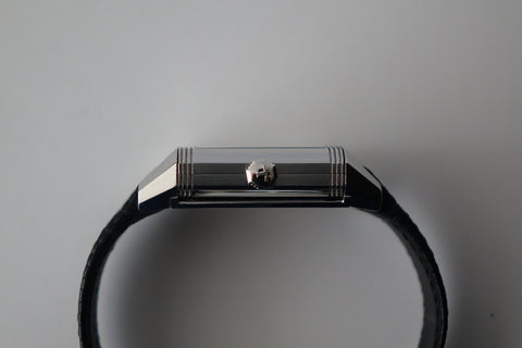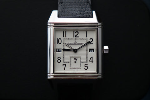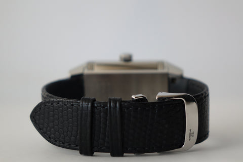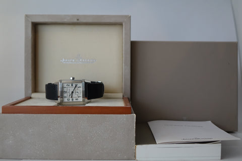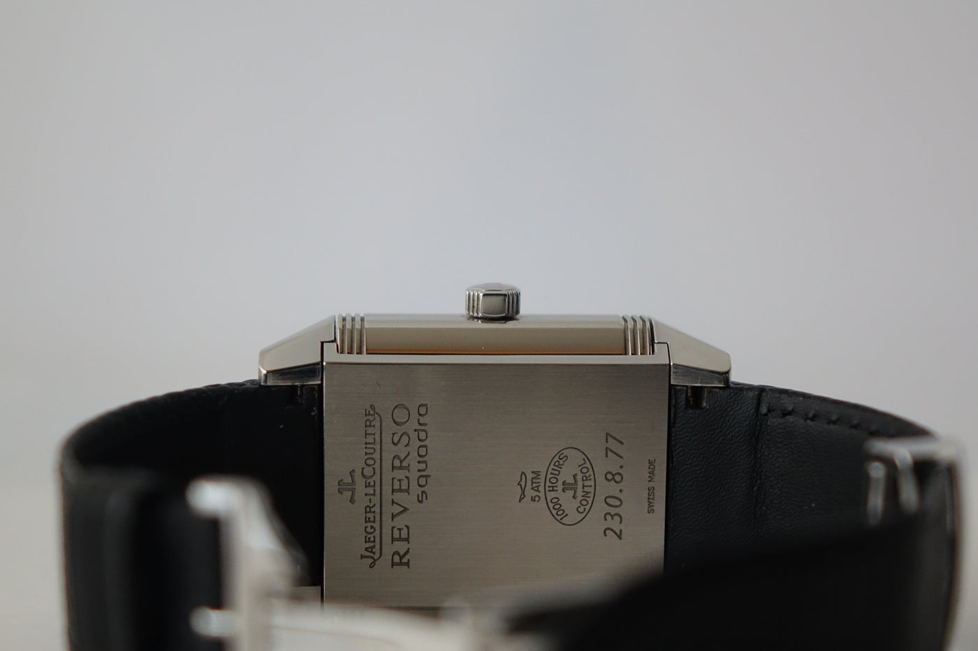Introduced in 2006, the Ref. Q7008420 is a bold and modern interpretation of the iconic Reverso, featuring a distinctive square reversible case measuring approximately 50.5 × 35mm. Designed with travellers in mind, it offers a practical second time zone, date display and highly legible silver guilloché dial with contrasting numerals. Flip the watch over and the sapphire caseback reveals the beautifully finished automatic movement within. Combining the heritage of the legendary Jaeger-LeCoultre Reverso with a sportier, more masculine presence, the Squadra Hometime is a distinctive and versatile take on one of watchmaking’s most recognisable designs.