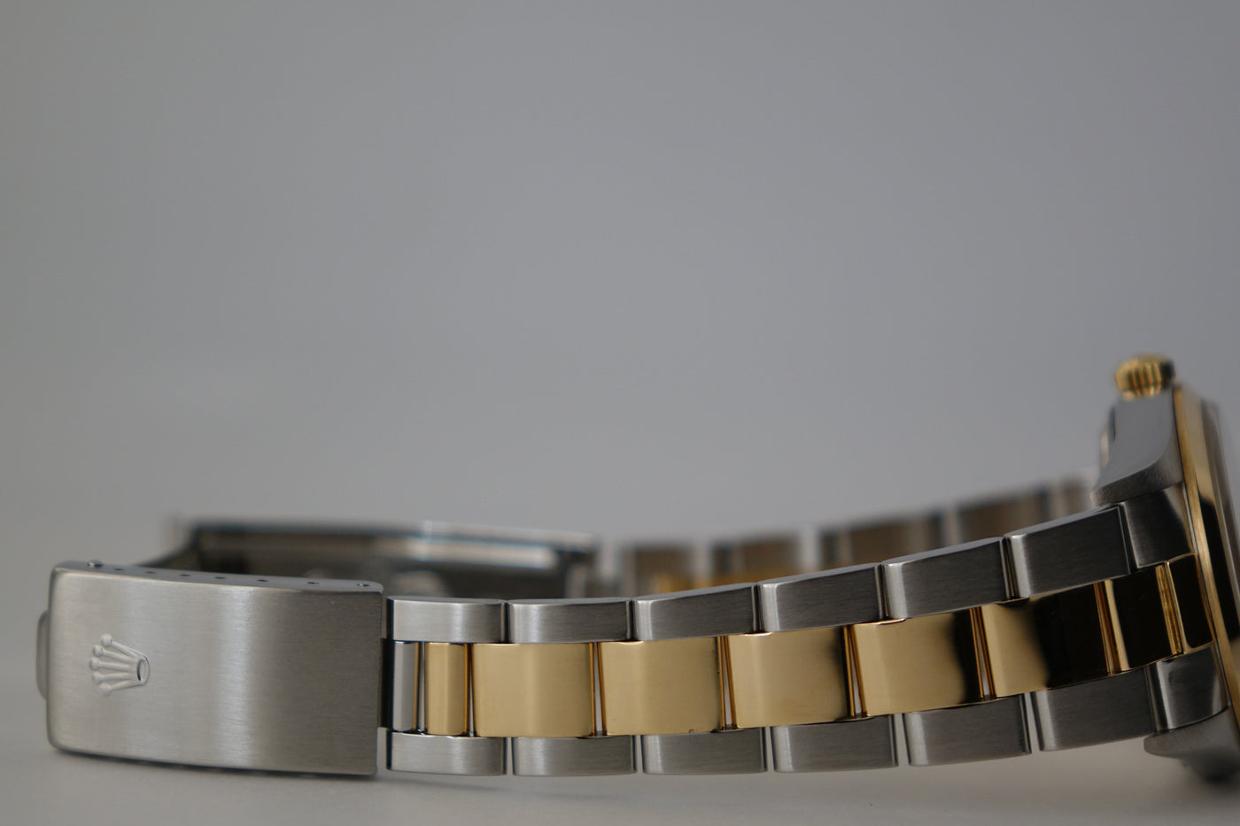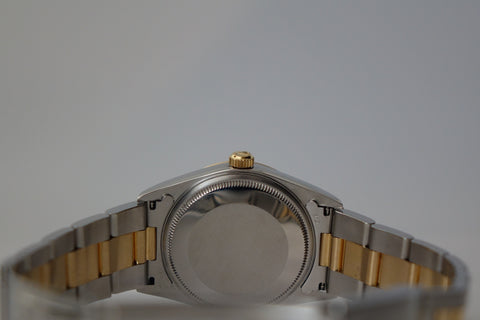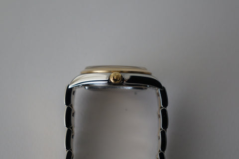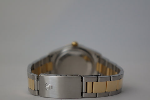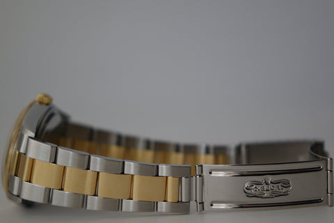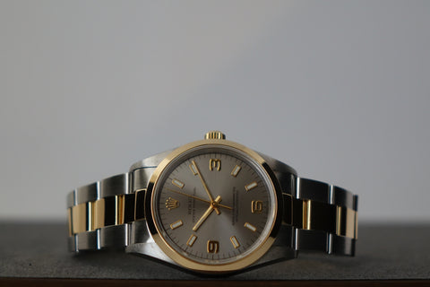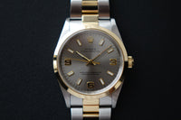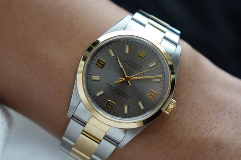 The Rolex 14203 OP 34 is one of those quietly uncommon references that stands out once you look closer — a two-tone execution of Rolex’s classic OP line, produced in far smaller numbers than the usual full-steel variants. This example is fitted with the clean grey 3-6-9 dial, giving it a sportier, Explorer-style visual while still retaining the time-only simplicity the Oyster Perpetual is known for, with the applied Arabic markers adding just enough character against the sunburst backdrop. The blend of understated OP DNA, steel-and-yellow-gold construction, slimmer case proportions, and neo-vintage 5-digit charm makes it a great pick for collectors who want something recognisably Rolex, but far less common than the standard OP lineup.