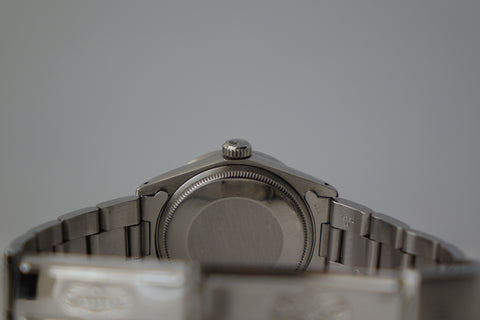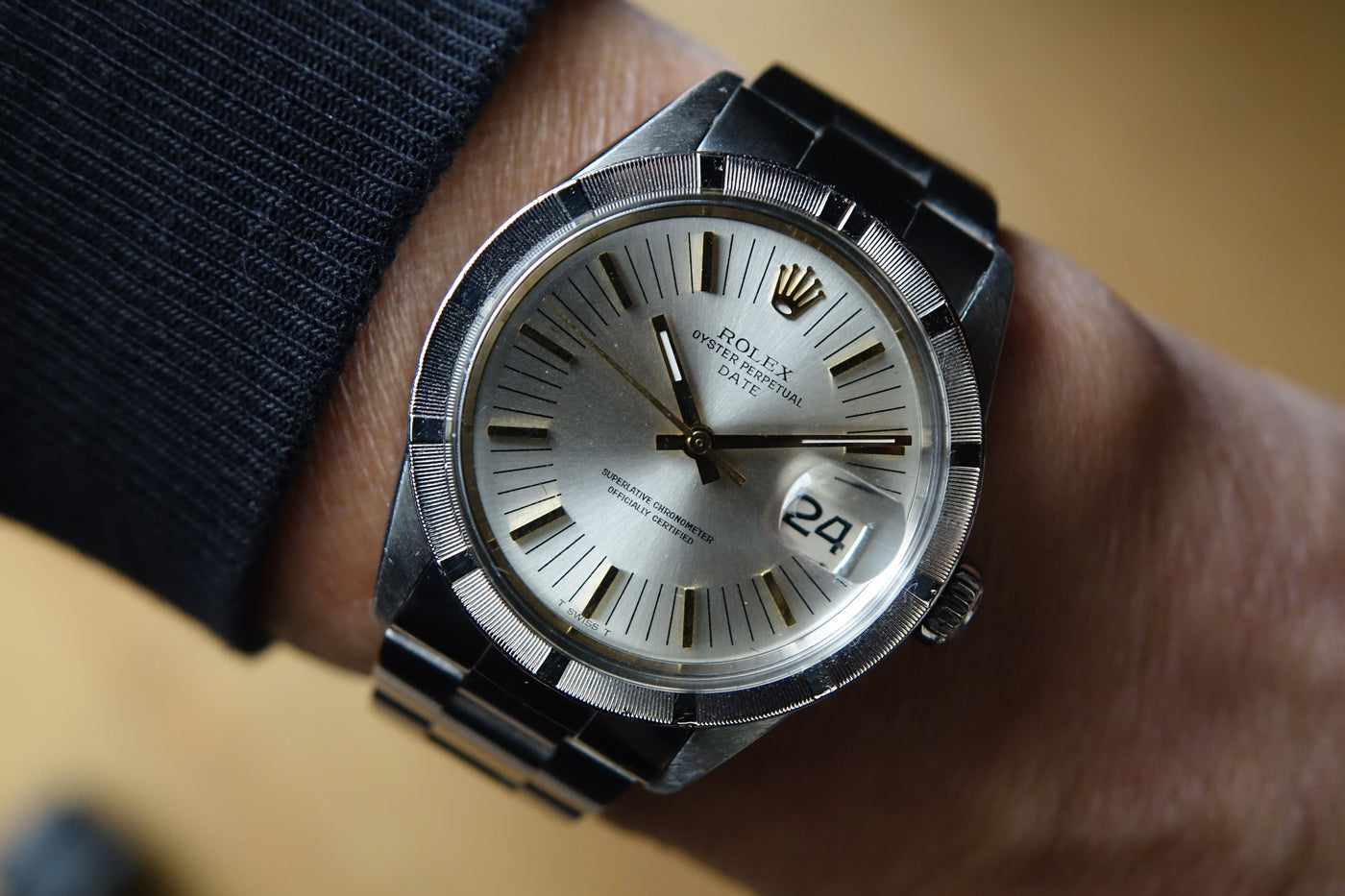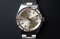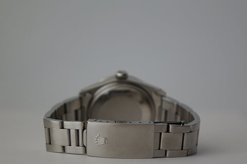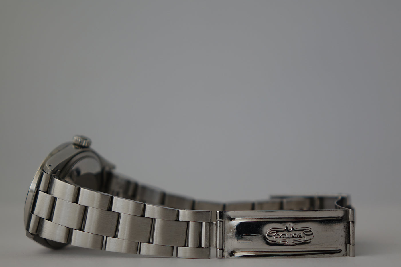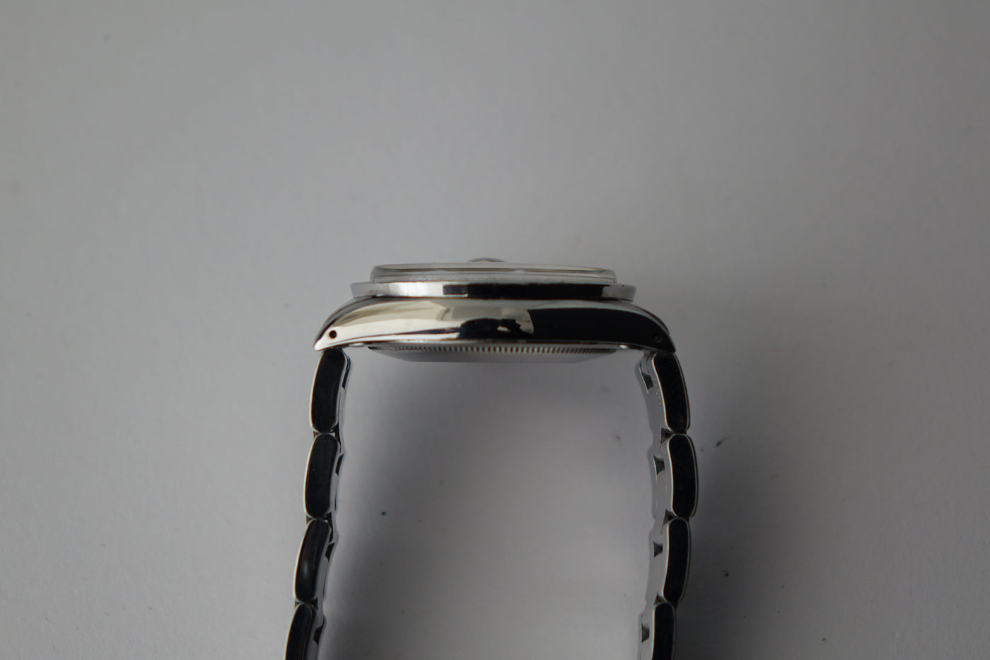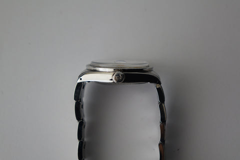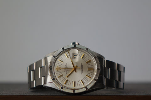 The Rolex Oyster Perpetual 34 1501 Radial Dial is a clean vintage reference distinguished by its rarer radial-brushed dial — a configuration far less commonly seen than the standard sunburst variants. The subtle vertical finishing gives the dial depth and texture while remaining understated and elegant. Paired with the classic 34mm Oyster case and engine-turned bezel, it wears balanced and effortlessly versatile on the wrist. Radial dial examples are genuinely uncommon in today’s market, making this a strong piece for collectors who appreciate harder-to-find variations with authentic vintage character.