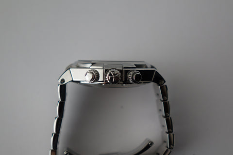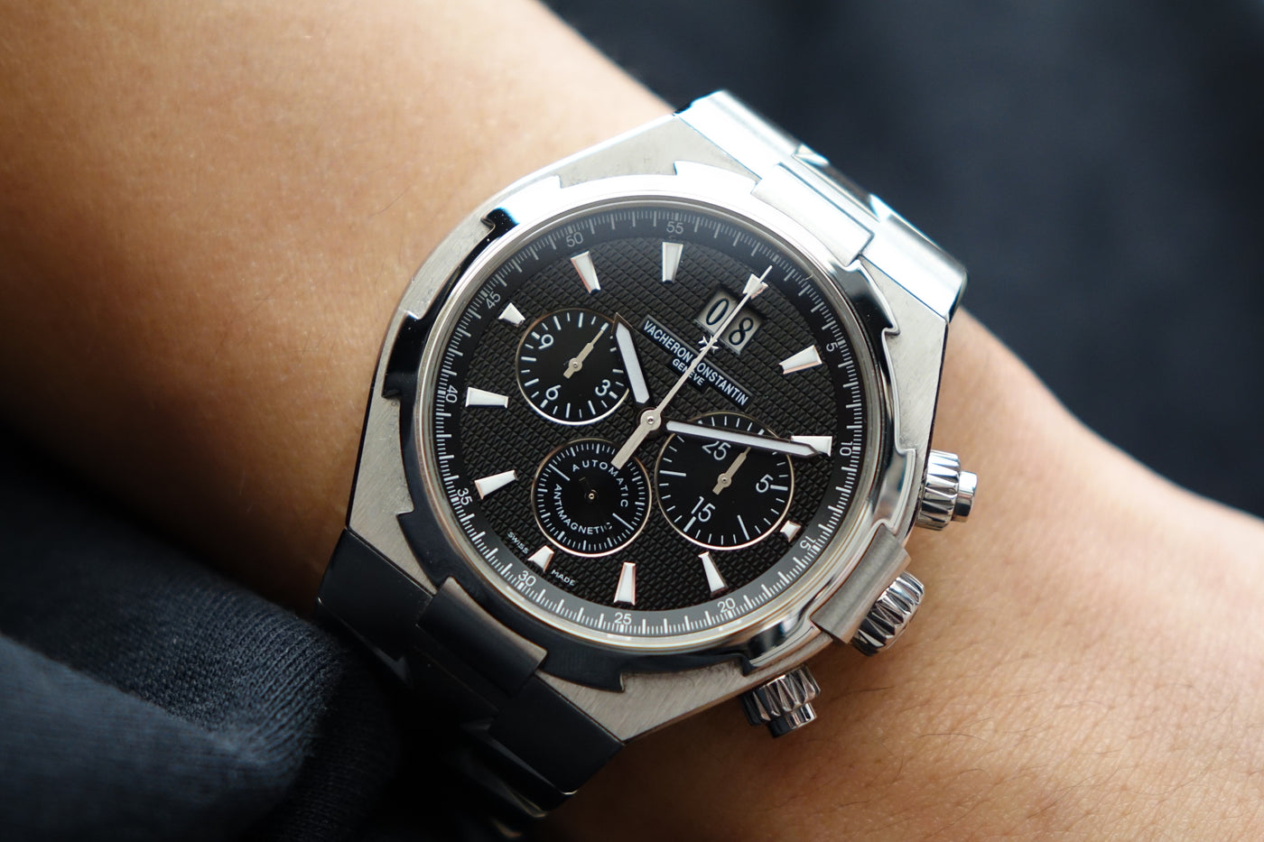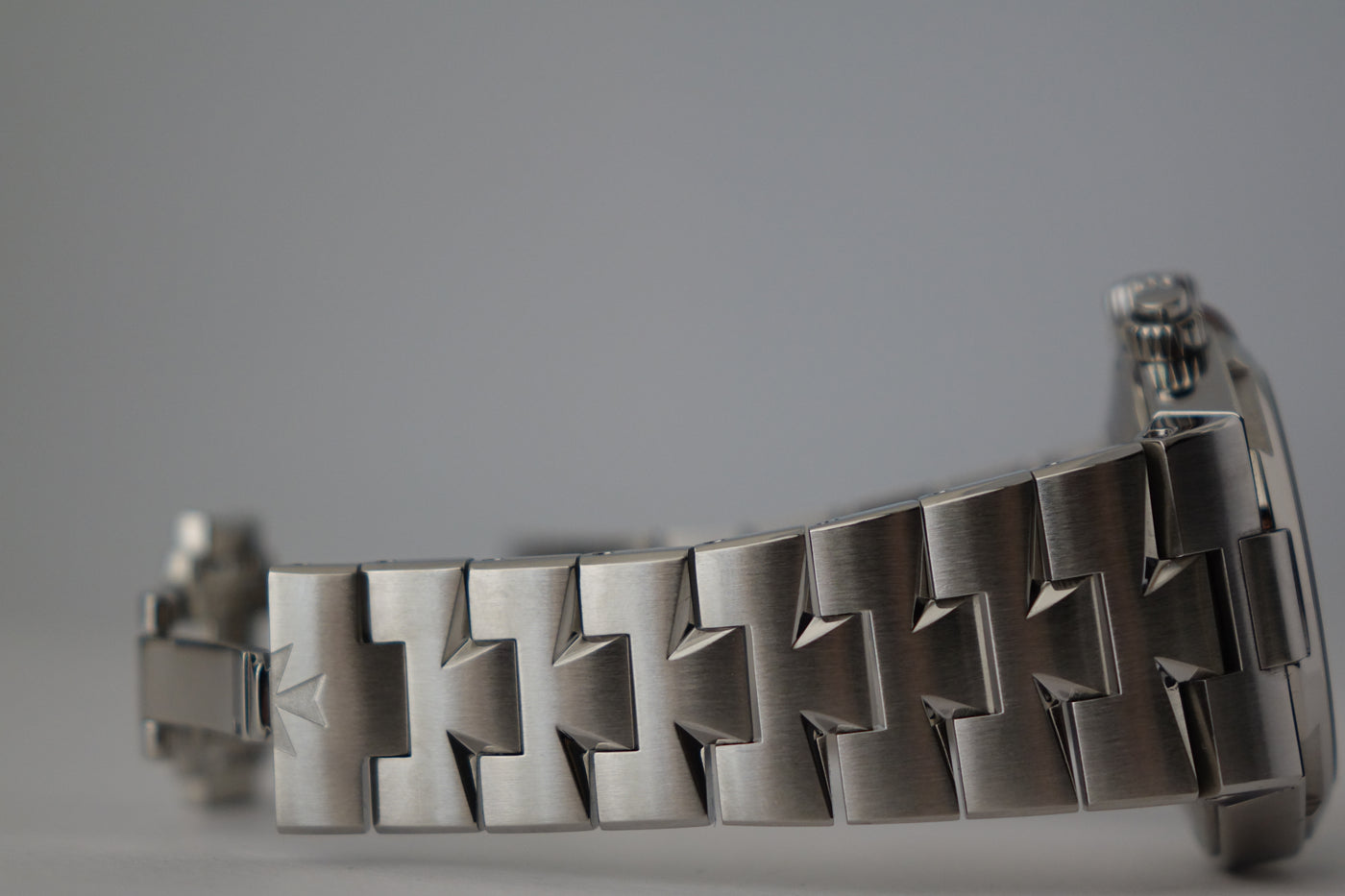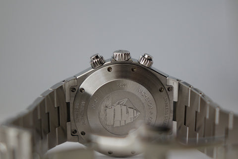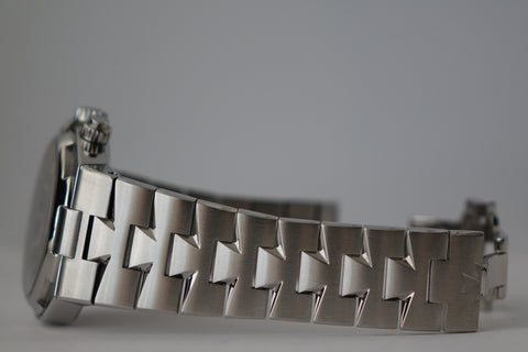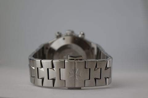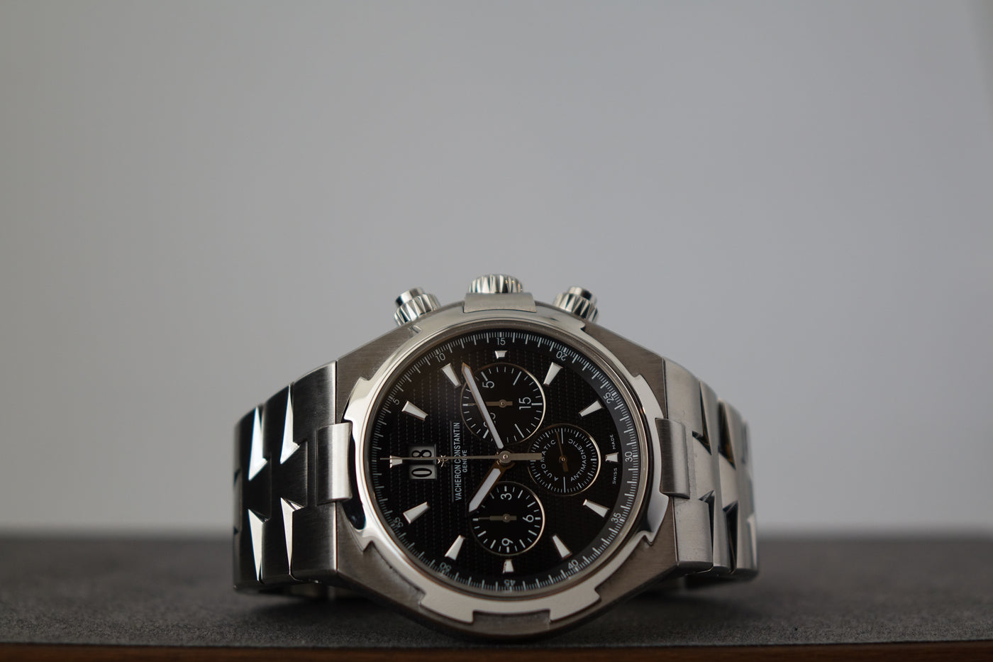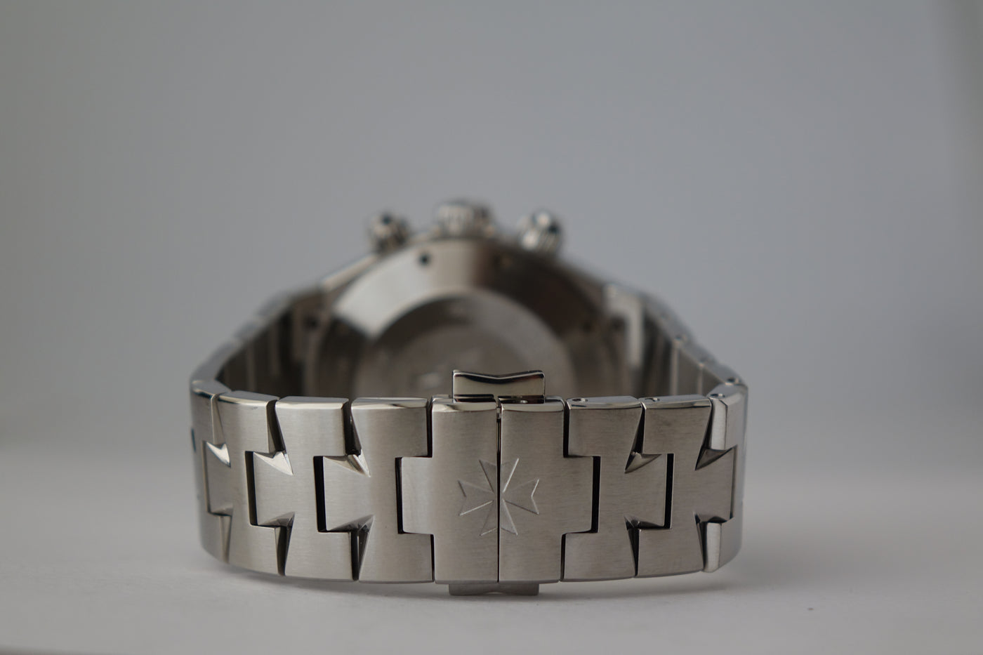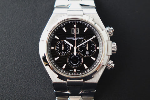 The Vacheron Constantin Overseas 49150 features the distinctive black military dial, one of the most unique and collectible configurations of the second-generation Overseas. With its bold Arabic numerals, Maltese-cross bezel, integrated bracelet design, and strong wrist presence, this reference captures Vacheron’s modern approach to the luxury sports chronograph. A striking and uncommon variant from one of watchmaking’s “Holy Trinity” maisons.
